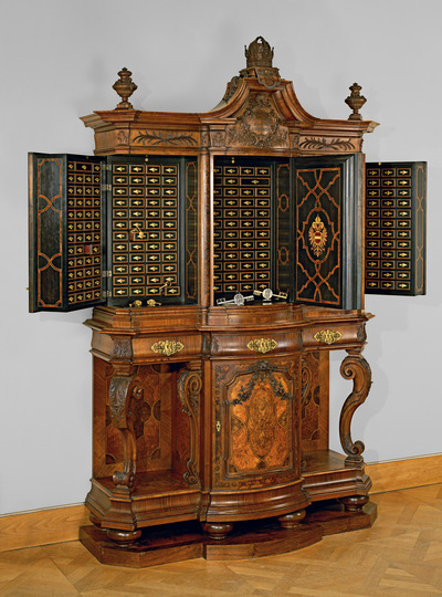 Um die Spannung nicht unnötig auf den Höhepunkt zu treiben, sei gleich hier erklärt: Der viertürige, neobarocke Holzschrank besteht im Inneren aus 139 kleinen Laden, von denen jede einzelne einen Schlüssel zum Sarg einer Persönlichkeit aus dem Hause Habsburg beherbergt.