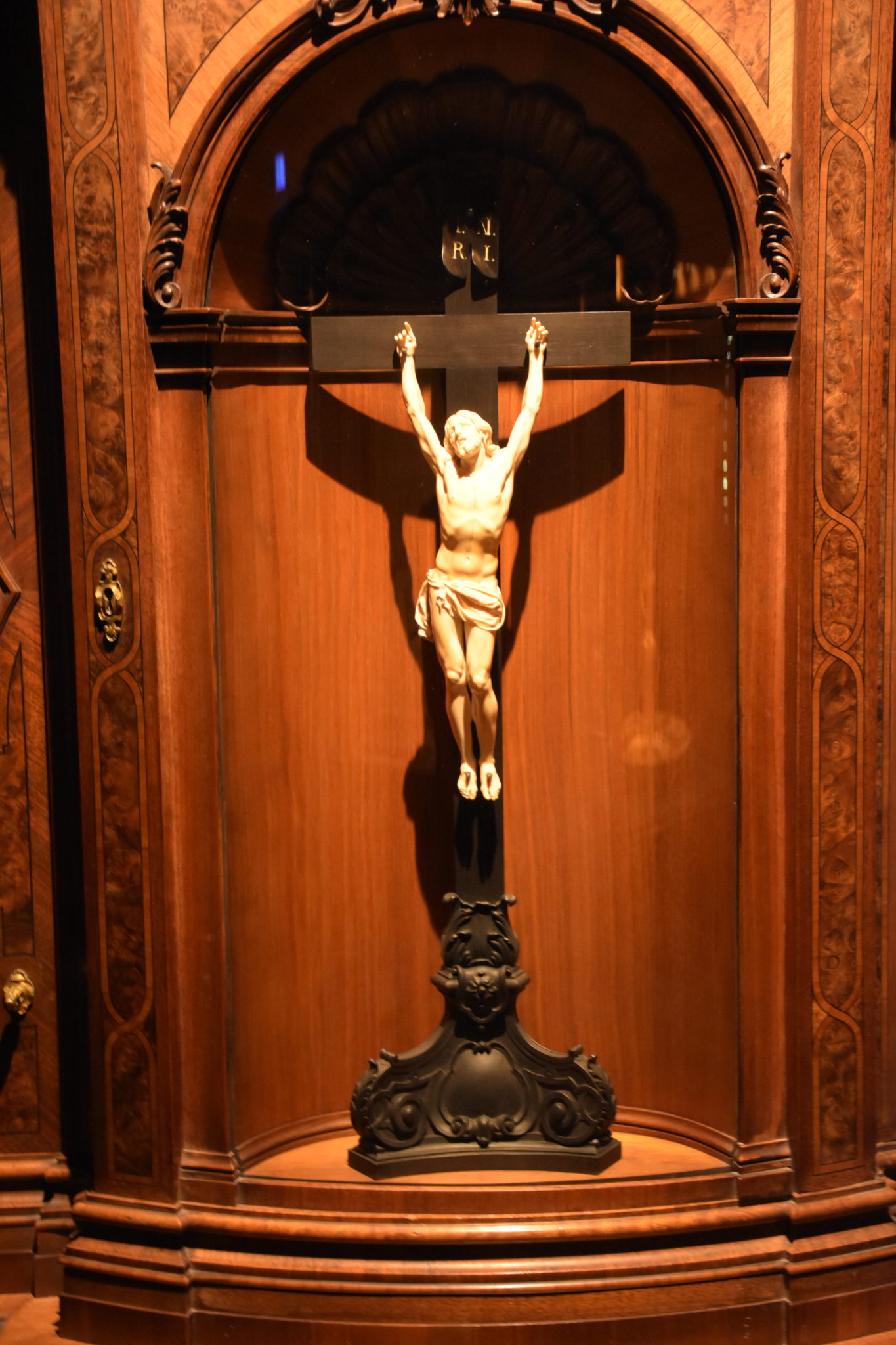 In die Mitteltür ist eine Nische eingebaut, die mit einem Elfenbeinkruzifix ausgestattet ist, welches wahrscheinlich von Gabriel Grupello 1695 am Düsseldorfer Hof gefertigt wurde, und nachträglich hier verwendet wurde.