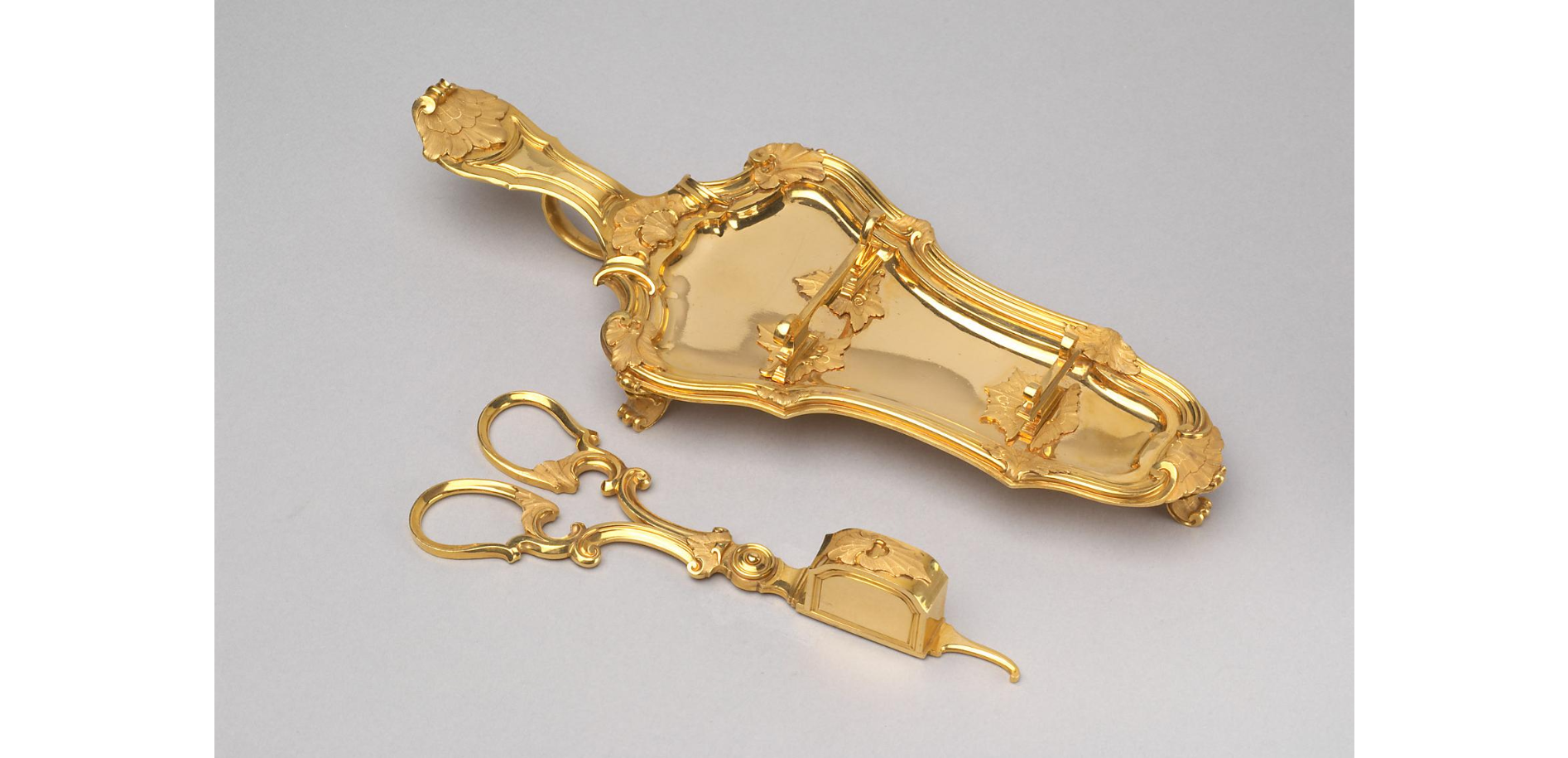 Lichtscheren, die in dieser Palette der Gebrauchsgegenstände ebenfalls enthalten sind, wurden zum Kürzen des Kerzendochts verwendet. Die metallenen Teile der gesamten Garnitur sind ebenfalls aus schwerem Gold.