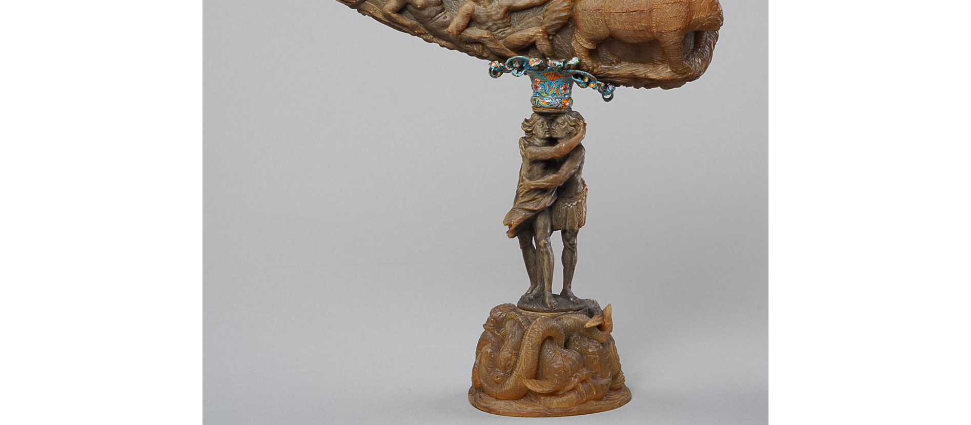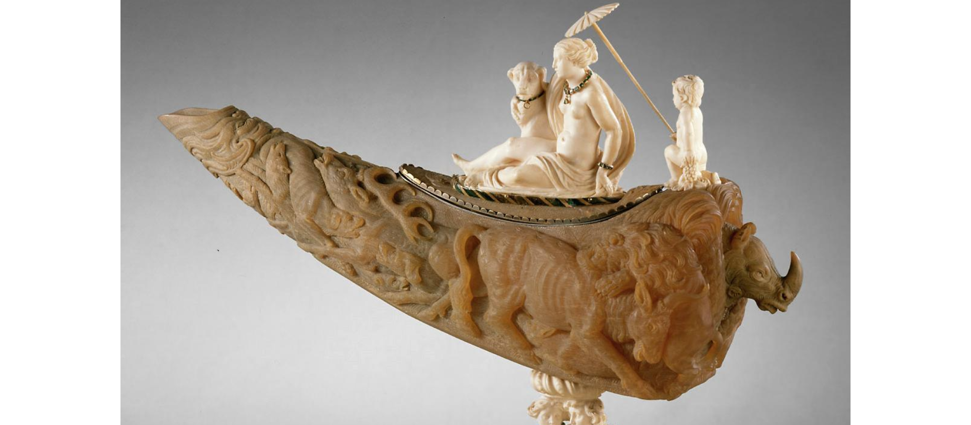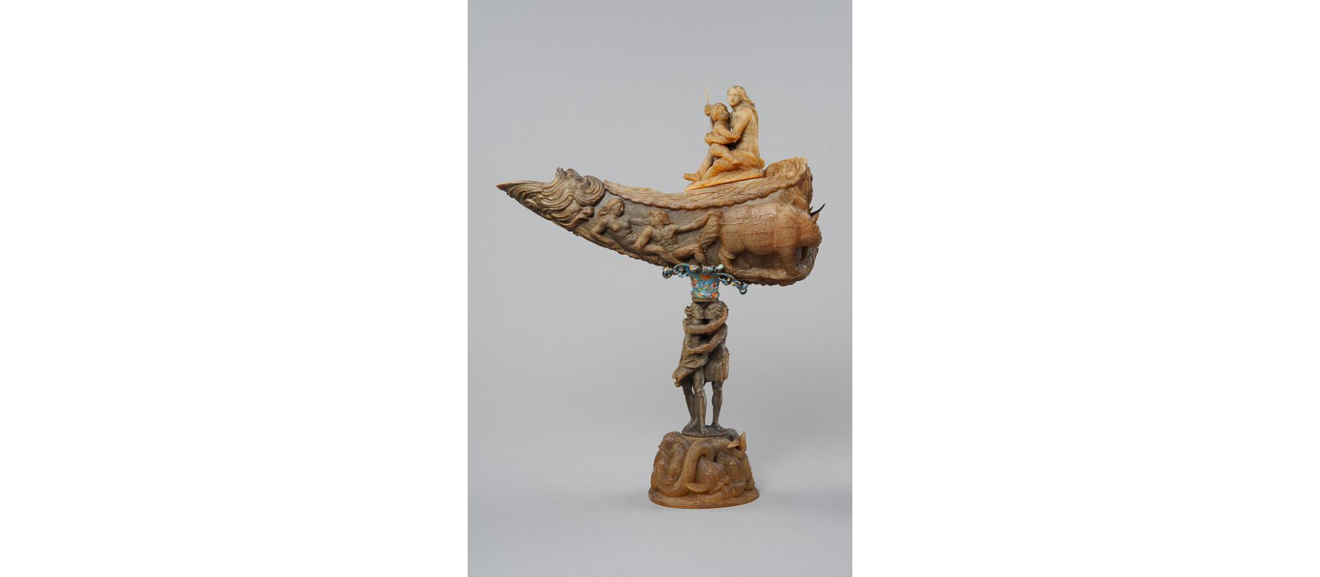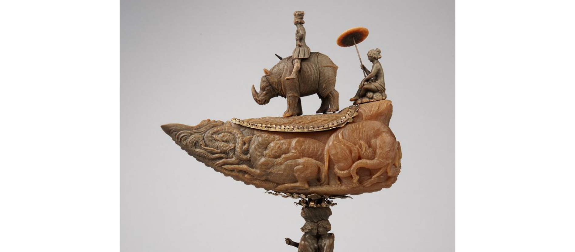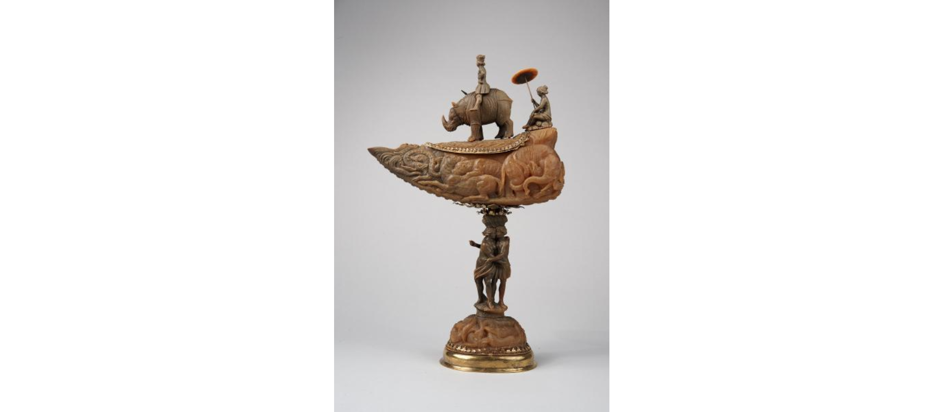 Der außergewöhnliche Pokal wurde um 1650 gefertigt und die Darstellung harmoniert perfekt mit dem Ausgangsmaterial: Rhinozeroshorn. Die Anfertigung wurde einem Allround-Künstler zugeschrieben: Georg Pfründt (1603-1663) der nicht weniger als Ingenieur, Baumeister, Medailleur, Wachsbossierer, Kupferstecher und Bildhauer war. Sein künstlerisches Handwerk erlernte er in Nürnberg und war danach für etliche Fürstenhäuser in Deutschland und Frankreich tätig.
