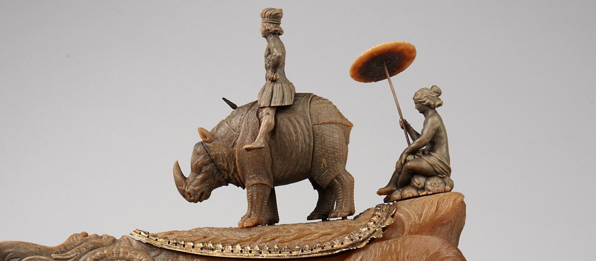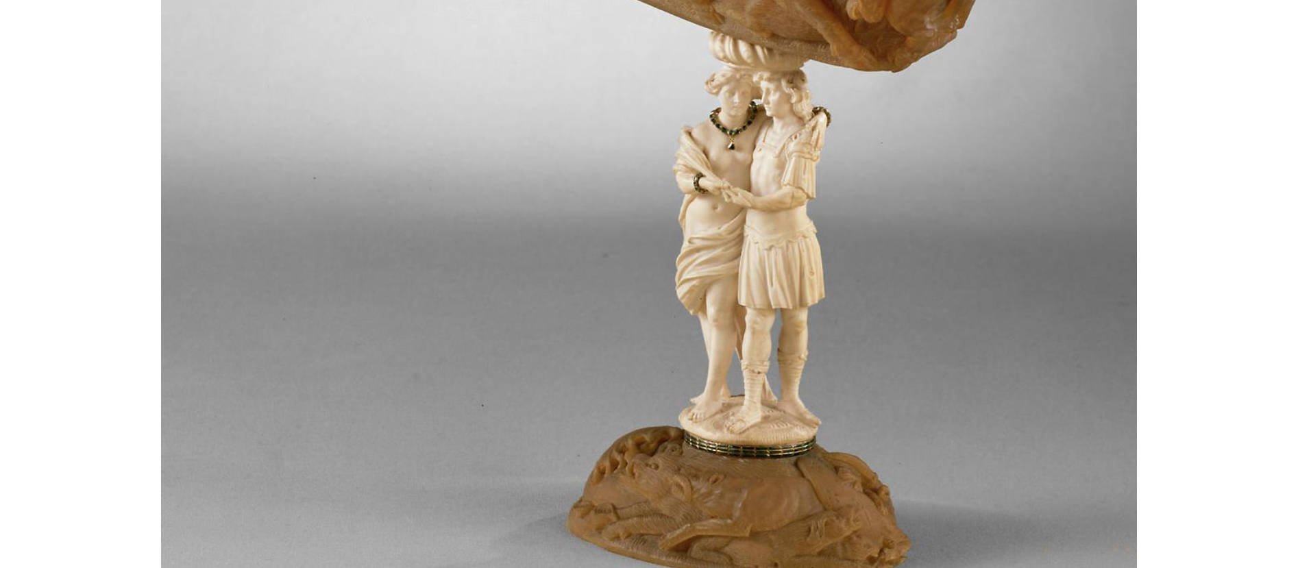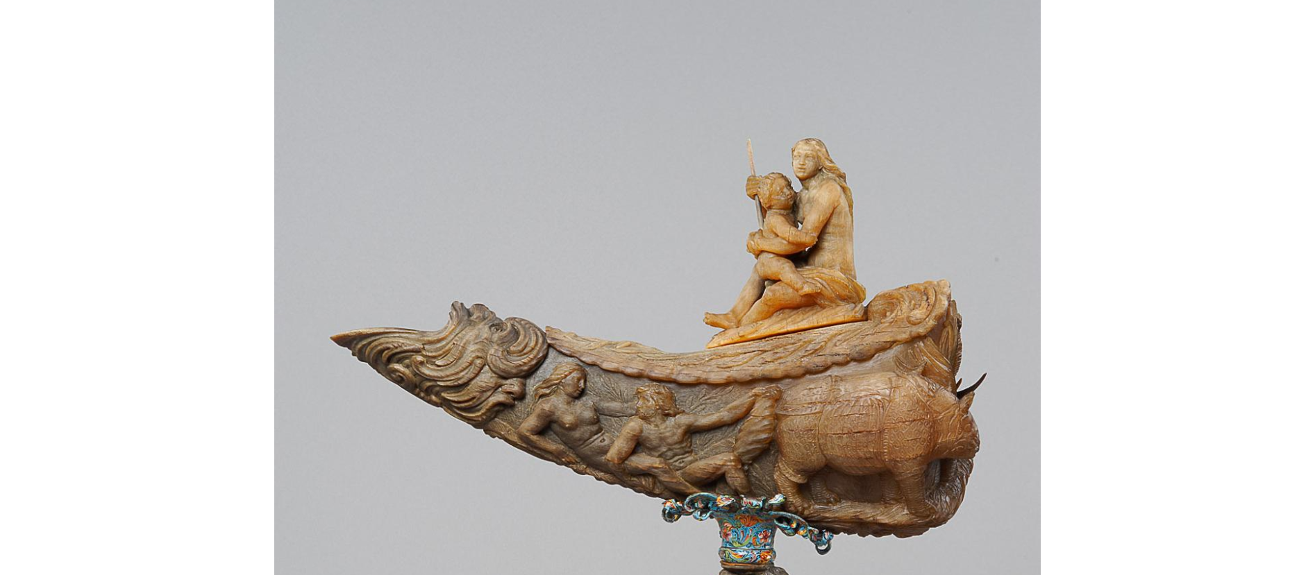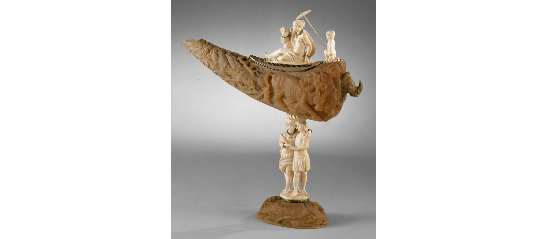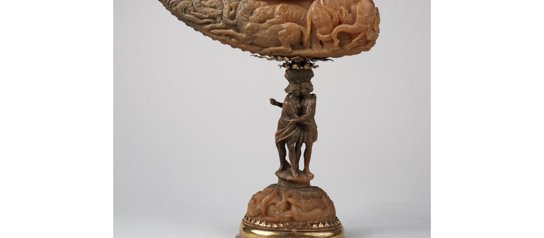 Der außergewöhnliche Pokal wurde um 1650 gefertigt und die Darstellung harmoniert perfekt mit dem Ausgangsmaterial: Rhinozeroshorn. Die Anfertigung wurde einem Allround-Künstler zugeschrieben: Georg Pfründt (1603-1663) der nicht weniger als Ingenieur, Baumeister, Medailleur, Wachsbossierer, Kupferstecher und Bildhauer war. Sein künstlerisches Handwerk erlernte er in Nürnberg und war danach für etliche Fürstenhäuser in Deutschland und Frankreich tätig.