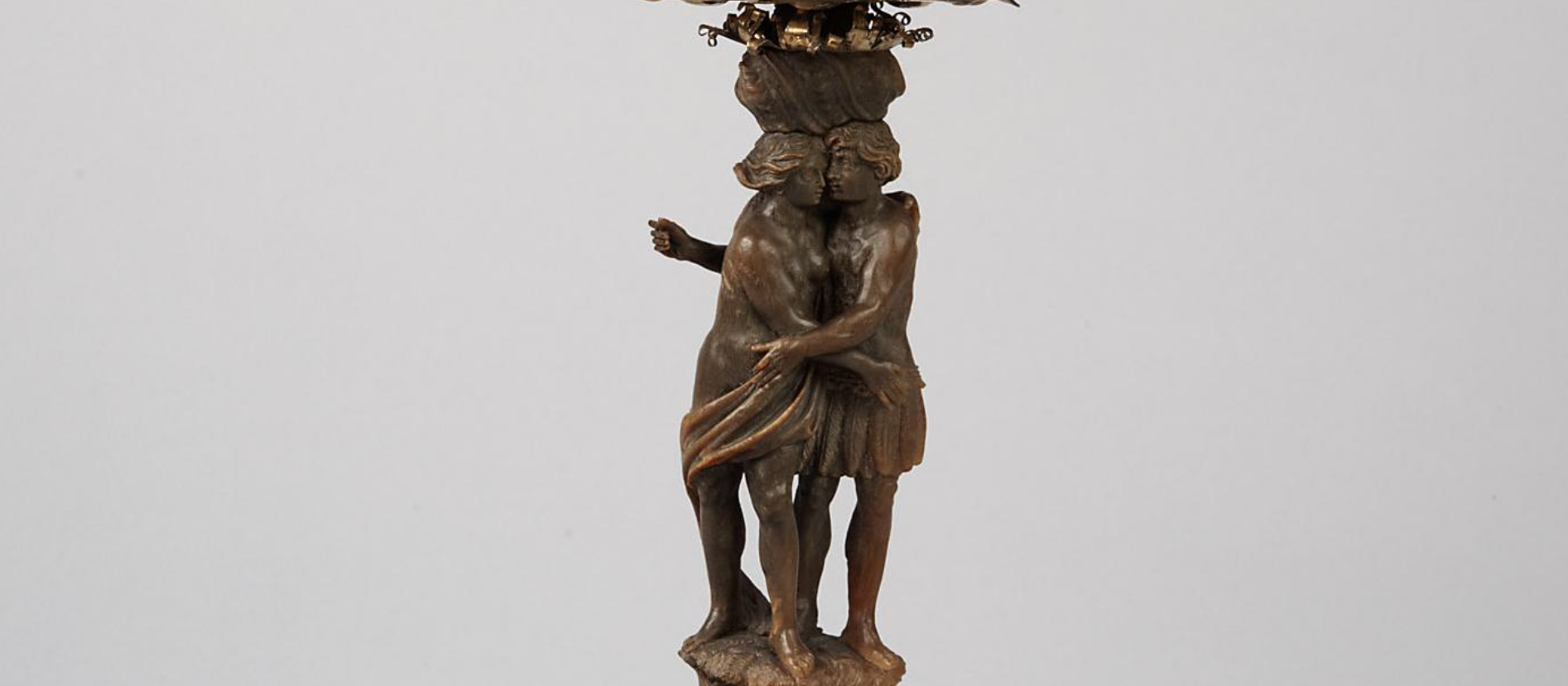 Auffallend ist auch, dass die Figuren auf dem Deckel und das Liebespaar am Schaft die gleiche Kleidung tragen, Lendenschurz und Federkleid.