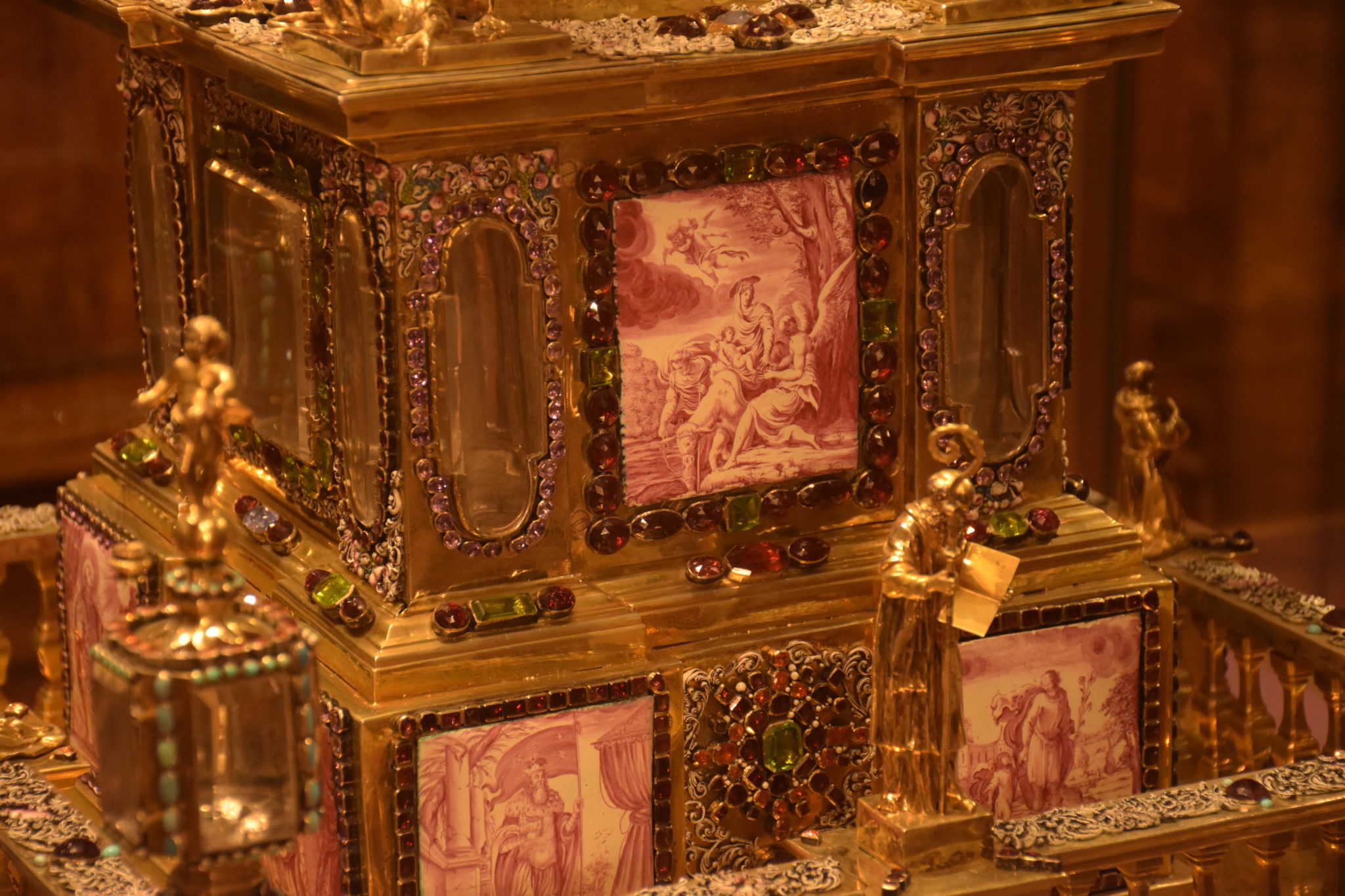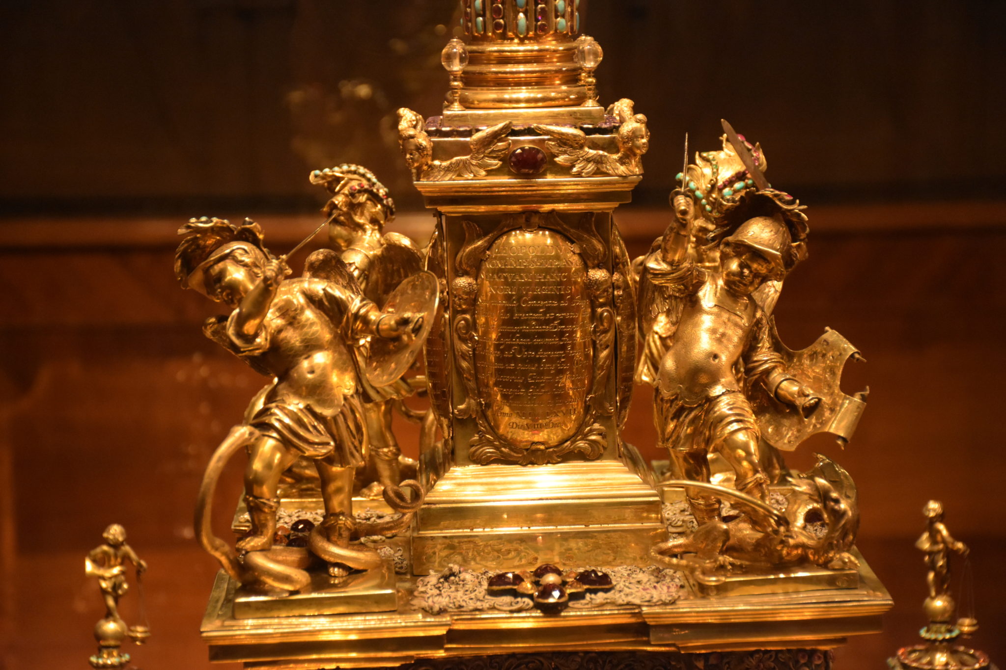 Das um 1687 gefertigte Schmuckstück hat trotz der Verkleinerung noch immer die imposante Höhe von 129cm, und sein Schöpfer war der Augsburger Goldschmied Philip Küsel (1642-1700). Einige künstlerische Abweichungen bestehen zum Original, und dass das Kleinod von vier Löwen getragen wird, ist die erste davon.