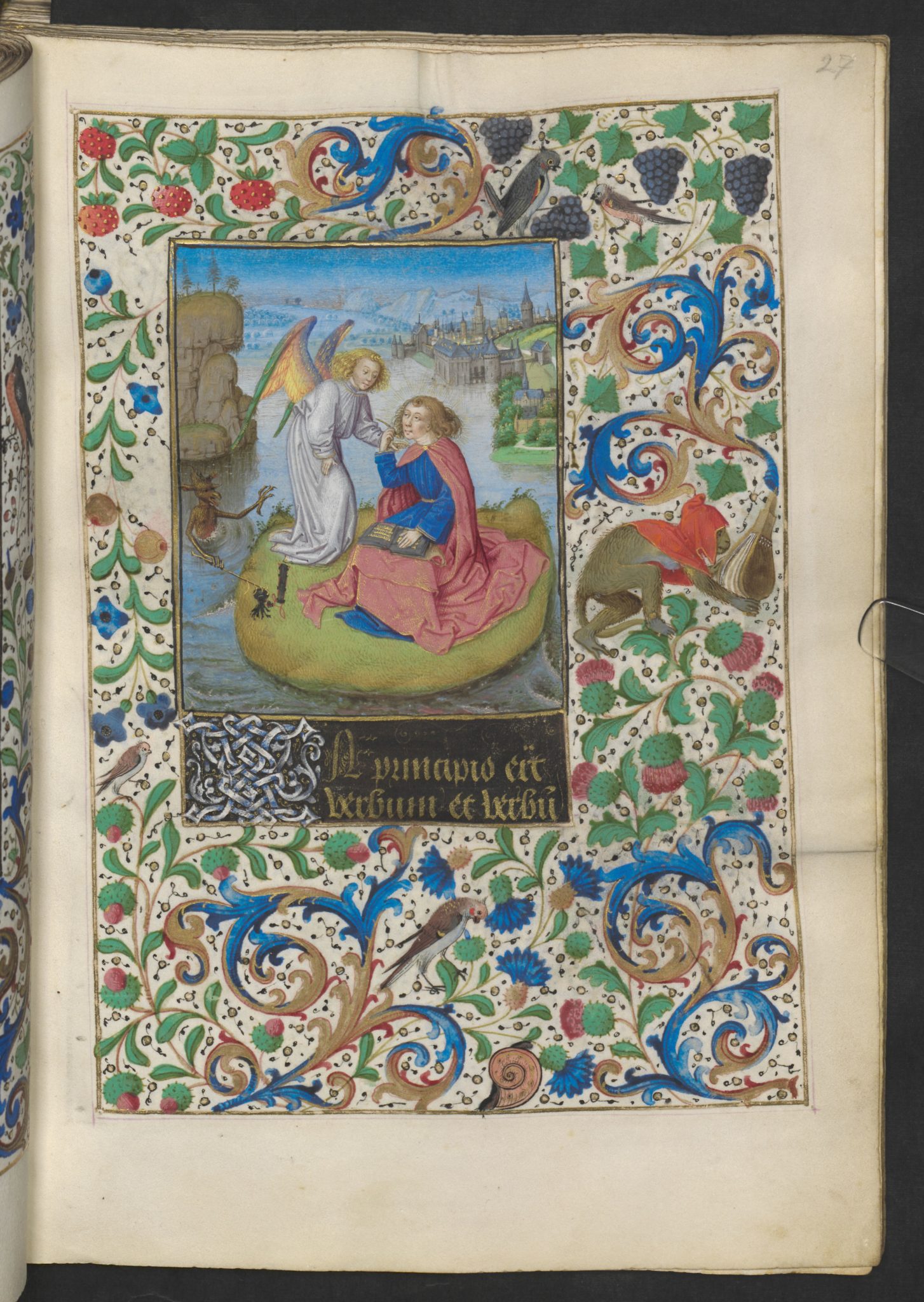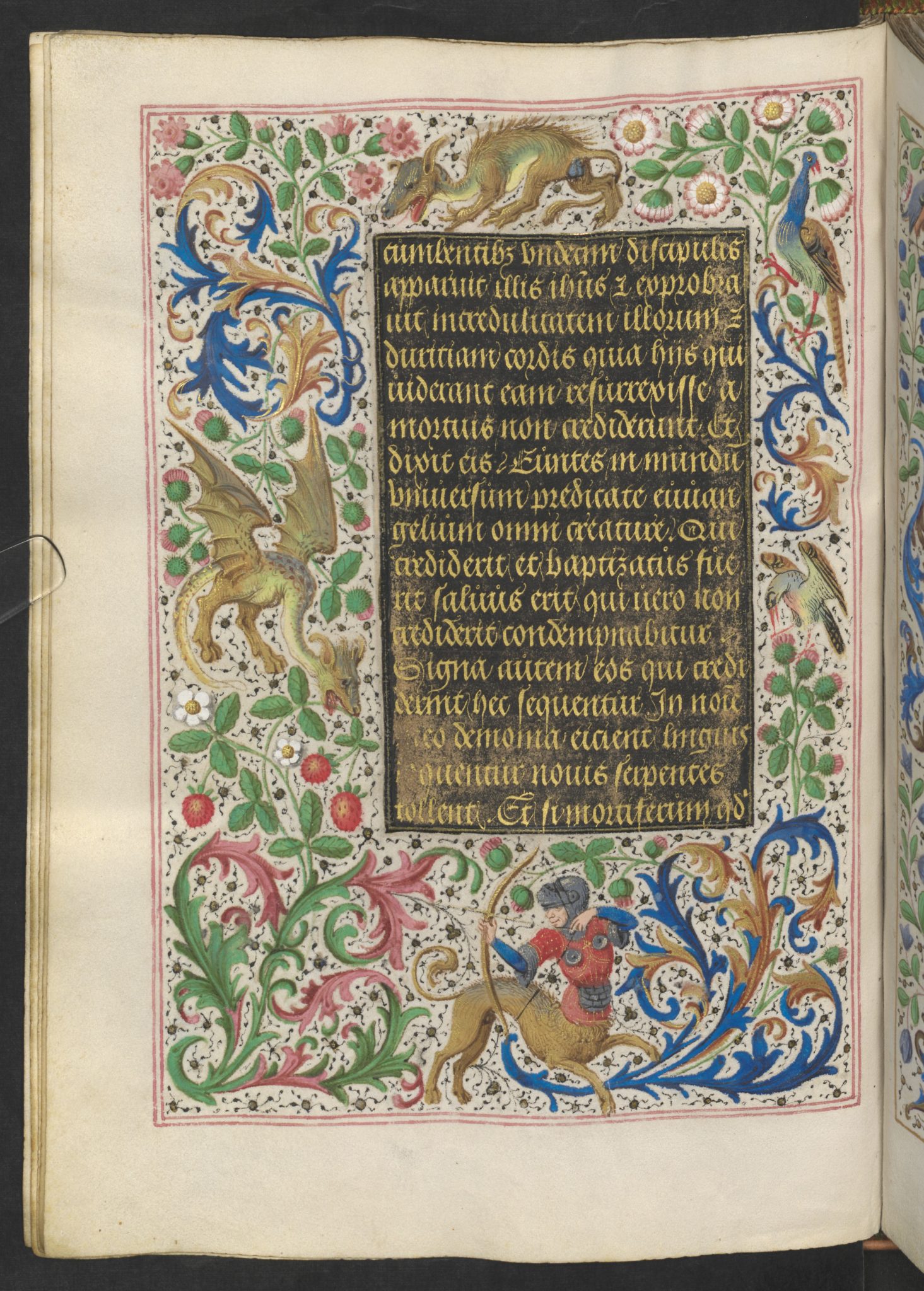 Aber abgesehen von den großformatigen Abbildungen, ist eigentlich jede Seite dieses Kunstwerks meisterlich. Die Bordüren sind überreich an Pflanzen, Blumen, Früchten, Vögeln, Fischen, Wild und exotischen Tieren. Aber auch Engel, Drachen, Fabelwesen, Jäger, Handwerker, Bettler, Musikanten und Artisten bevölkern diese Welt. Schier endlos war die Fantasie der daran Arbeitenden!