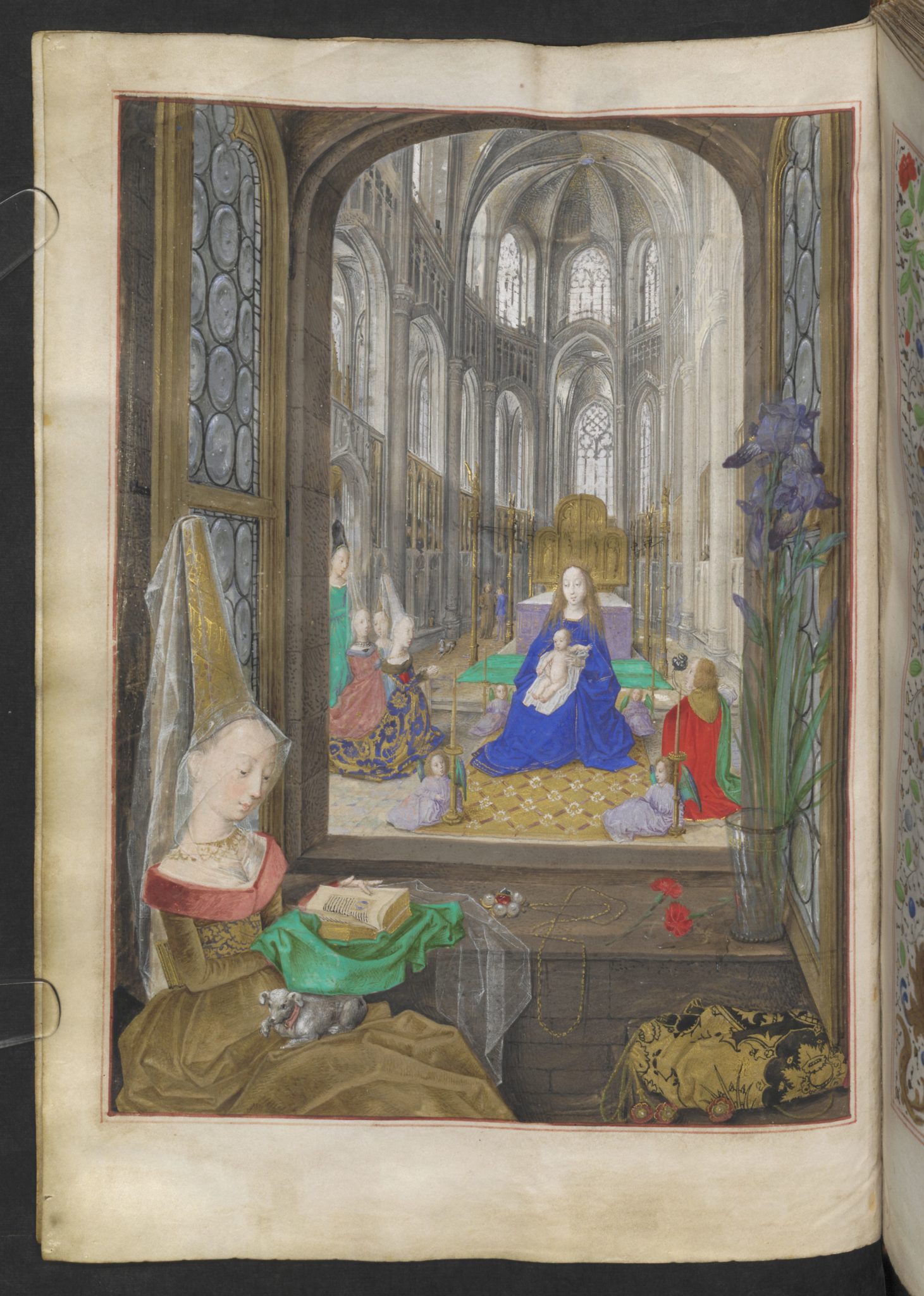 Auf Grund anderer Gemälde hält man es heute für sicher, dass es Maria selbst ist, welche am Fenster sitzt und aus ihrem Stundenbuch die Gebete rezitiert. Das Meisterhafte daran erschließt sich uns aus der Abbildung Marias mit ihrem Hündchen auf dem Schoss selbst, aber auch an den Gegenständen auf dem Fenstersims – der Halskette, dem durchsichtigen Schleier und den Schwertlilien in der Vase. Den Kirchenraum dahinter füllen die Mutter Gottes mit Kind, Betende und Engeln mit Kerzen an den 4 Ecken des Teppichs.