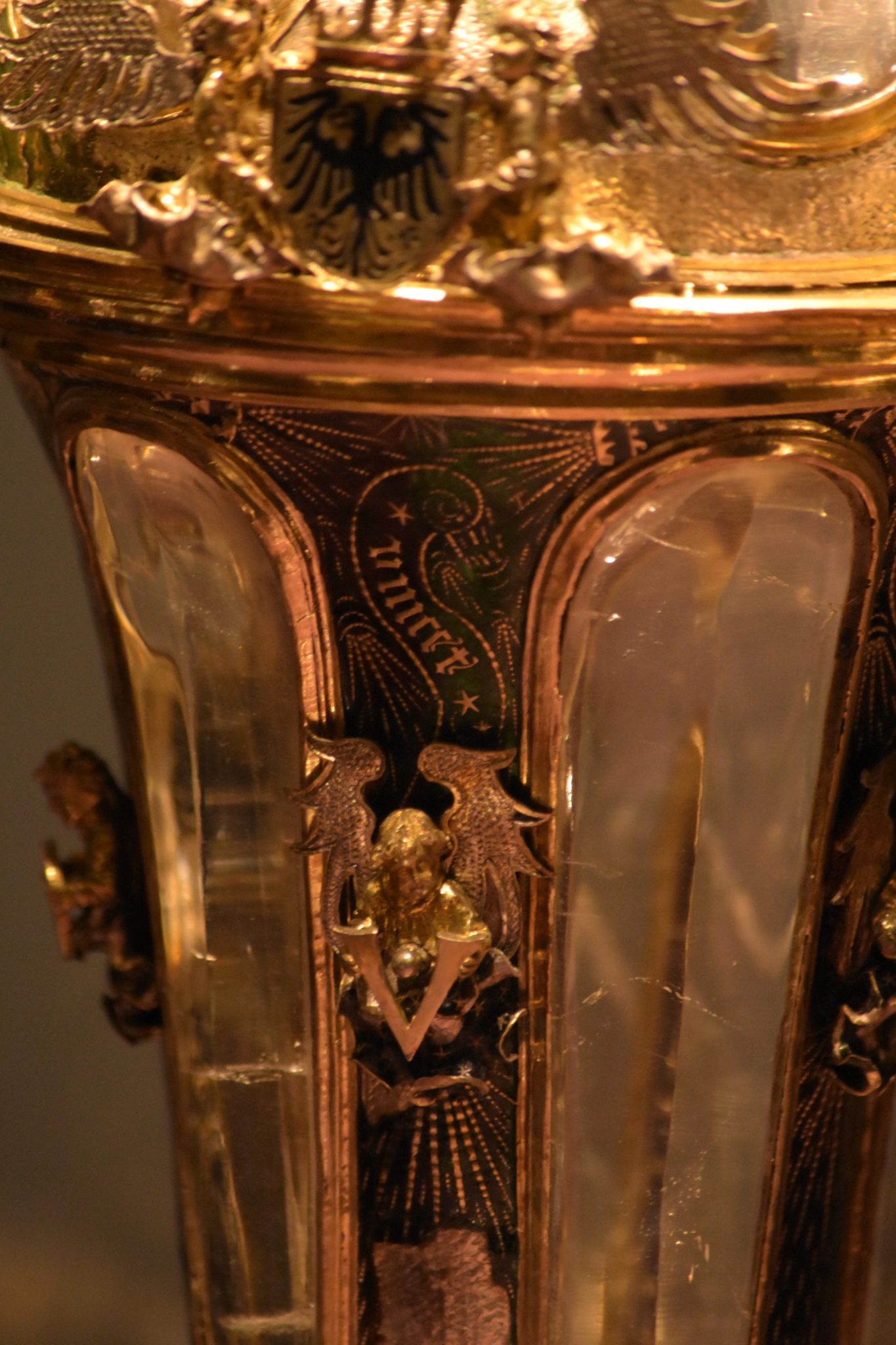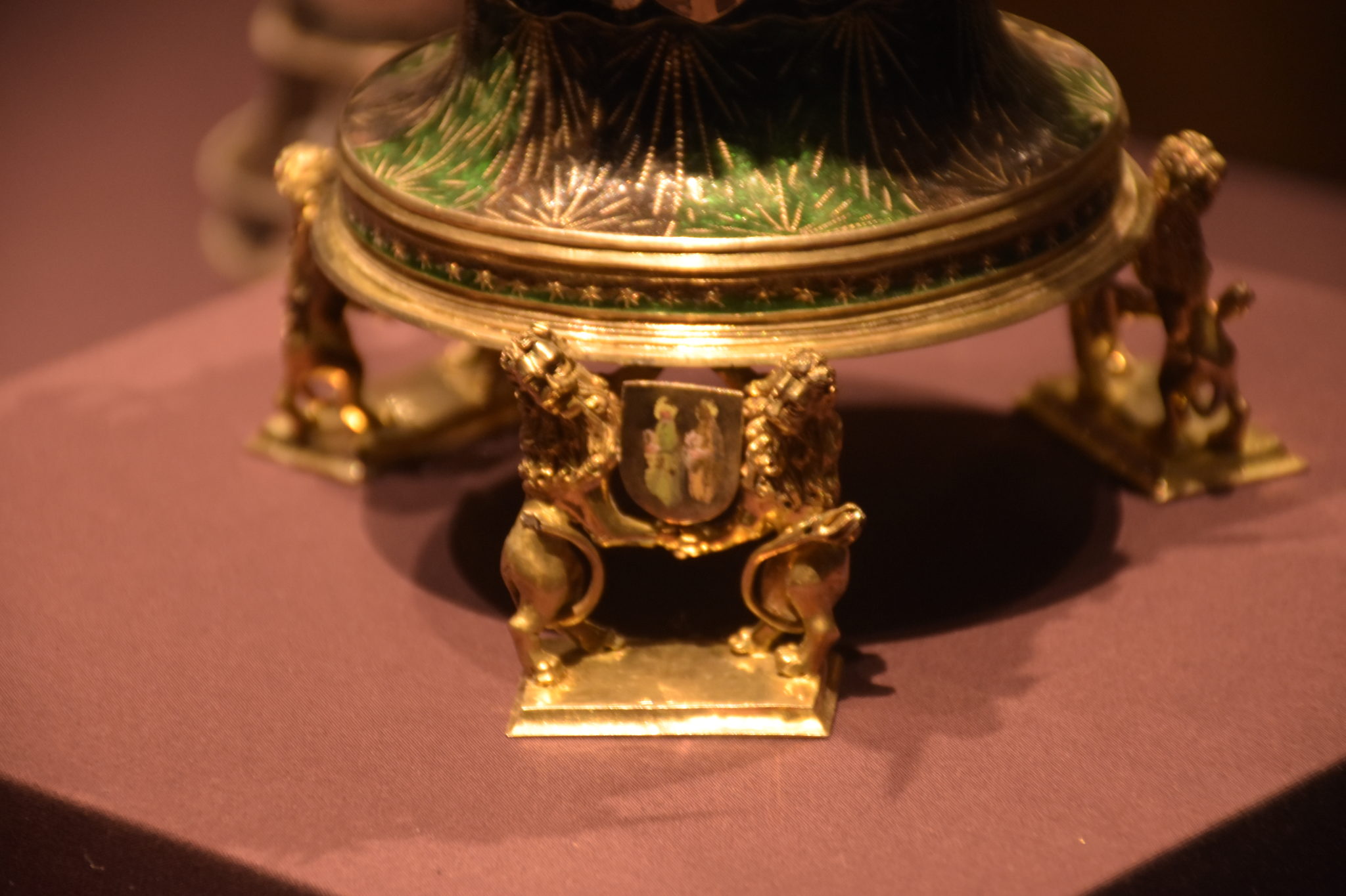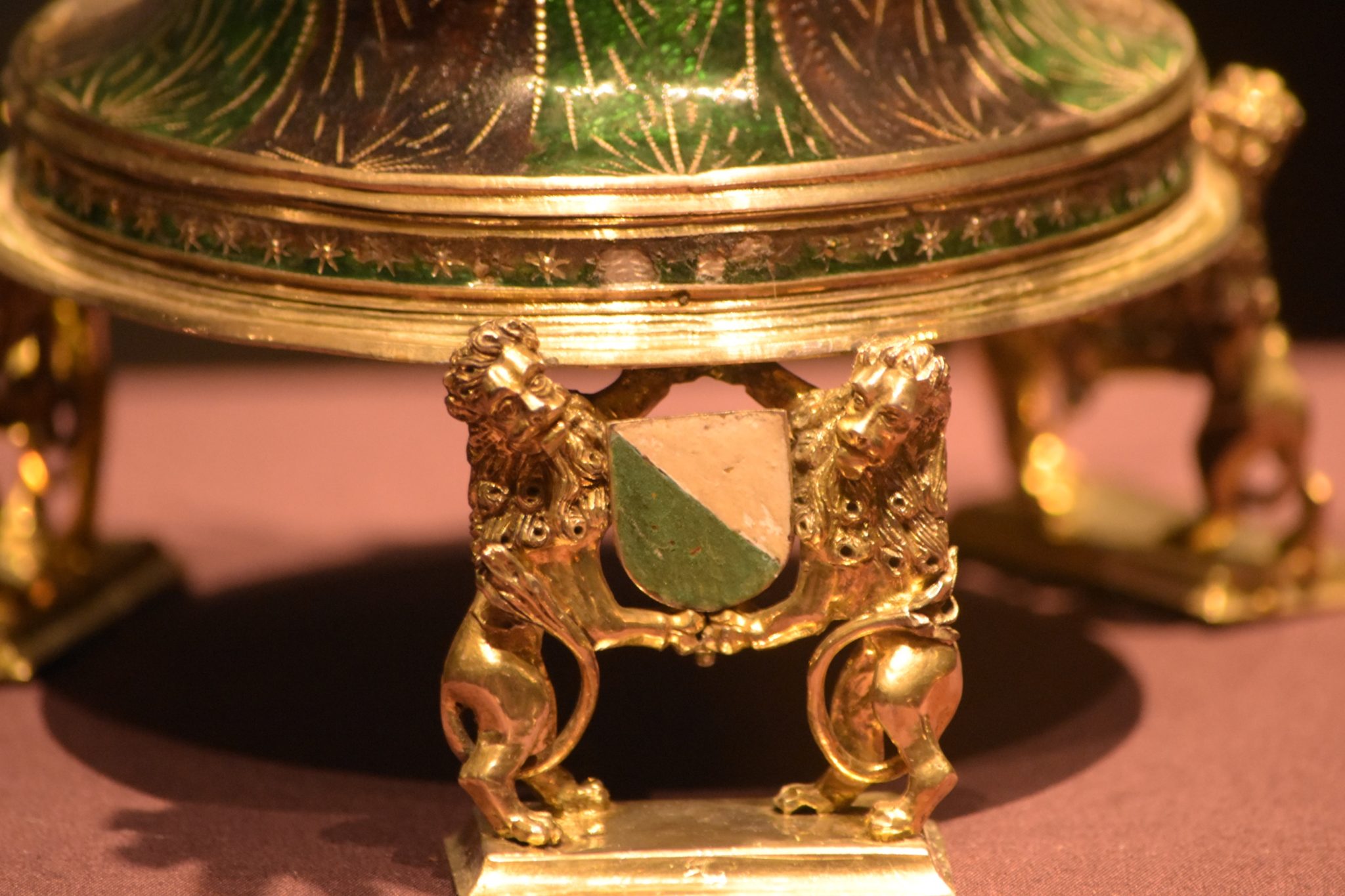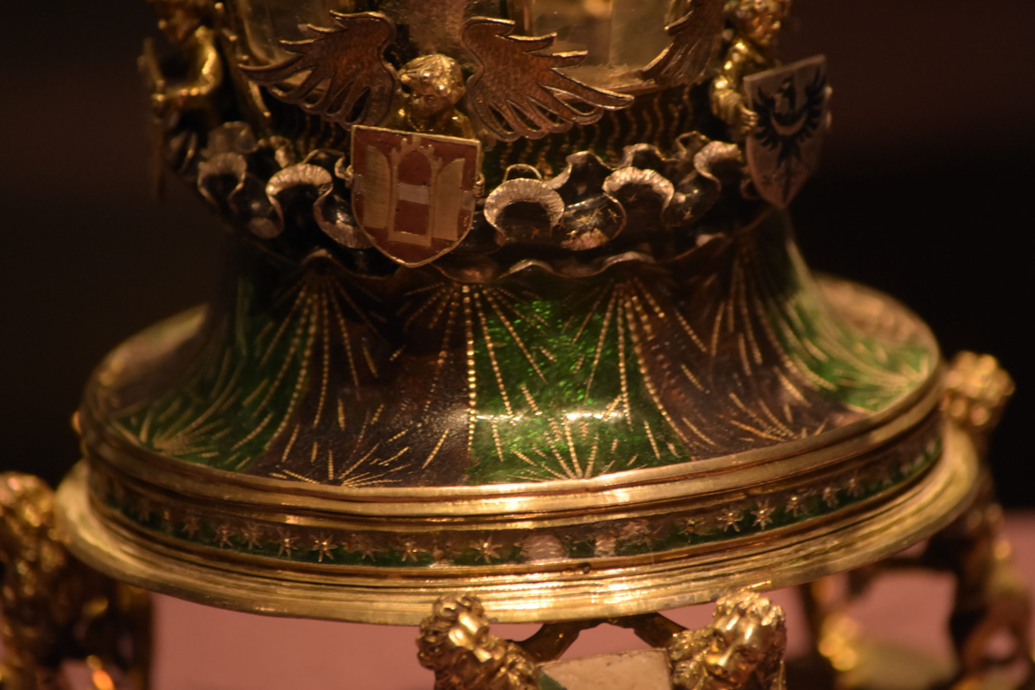 Getragen wird es von 3 Paar Löwen, welche Wappen in ihren Klauen tragen. Der Korpus ist bis zum Deckel mit färbig emaillierten Muster überzogen. Beim Emaillieren wird ein dünner, glasartiger Überzug auf den Gegenstand aufgeschmolzen, und zählt bis heute noch zu den größten Herausforderungen für Goldschmiede.