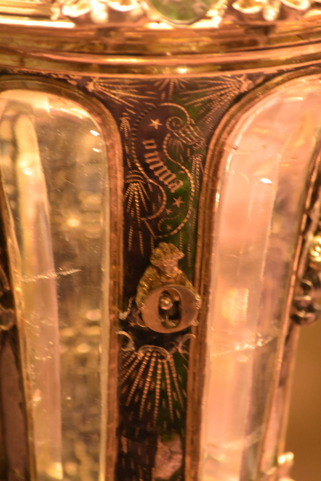 Die fensterähnlichen Durchlässe von Gefäß und Deckel sind mit Bergkristall gefüllt. Wappen oder Buchstaben tragende Engel verzieren den gesamten Pokal, und bekrönt wird er durch eine Figur, welche eine Fahne in der rechten Hand trägt.