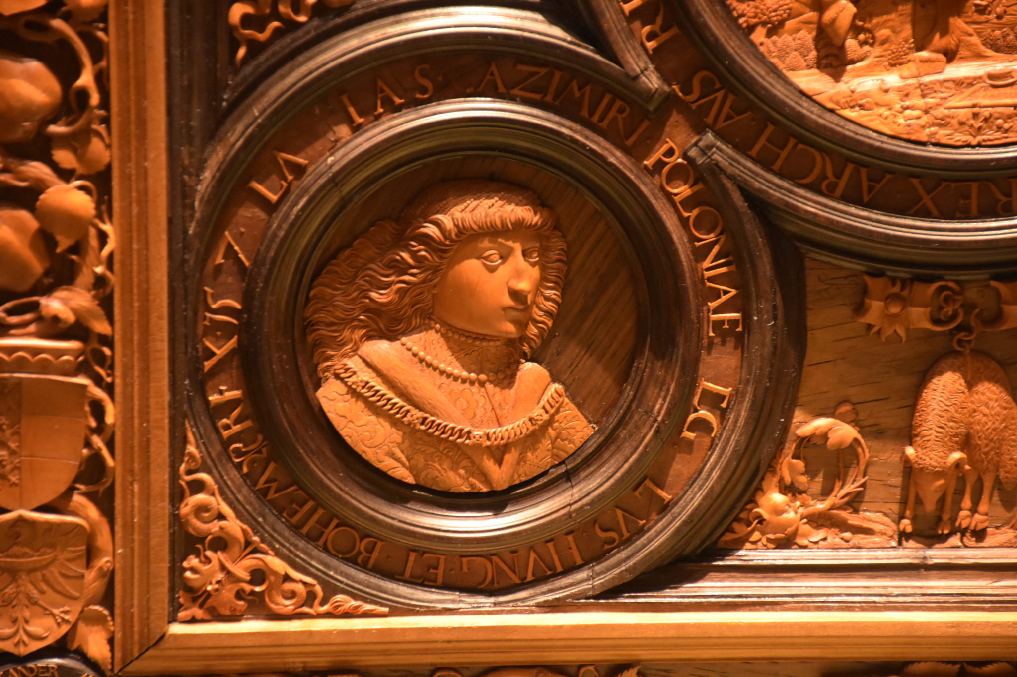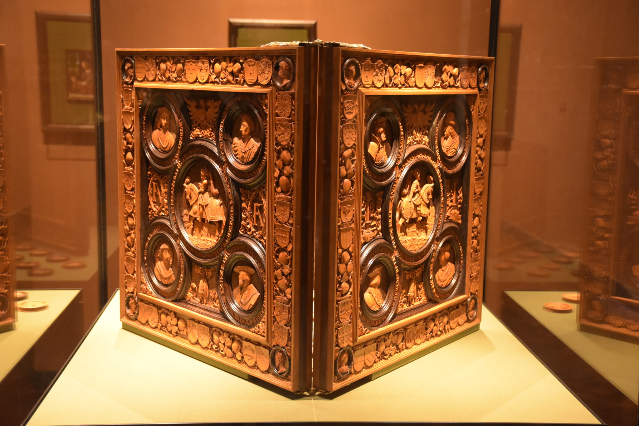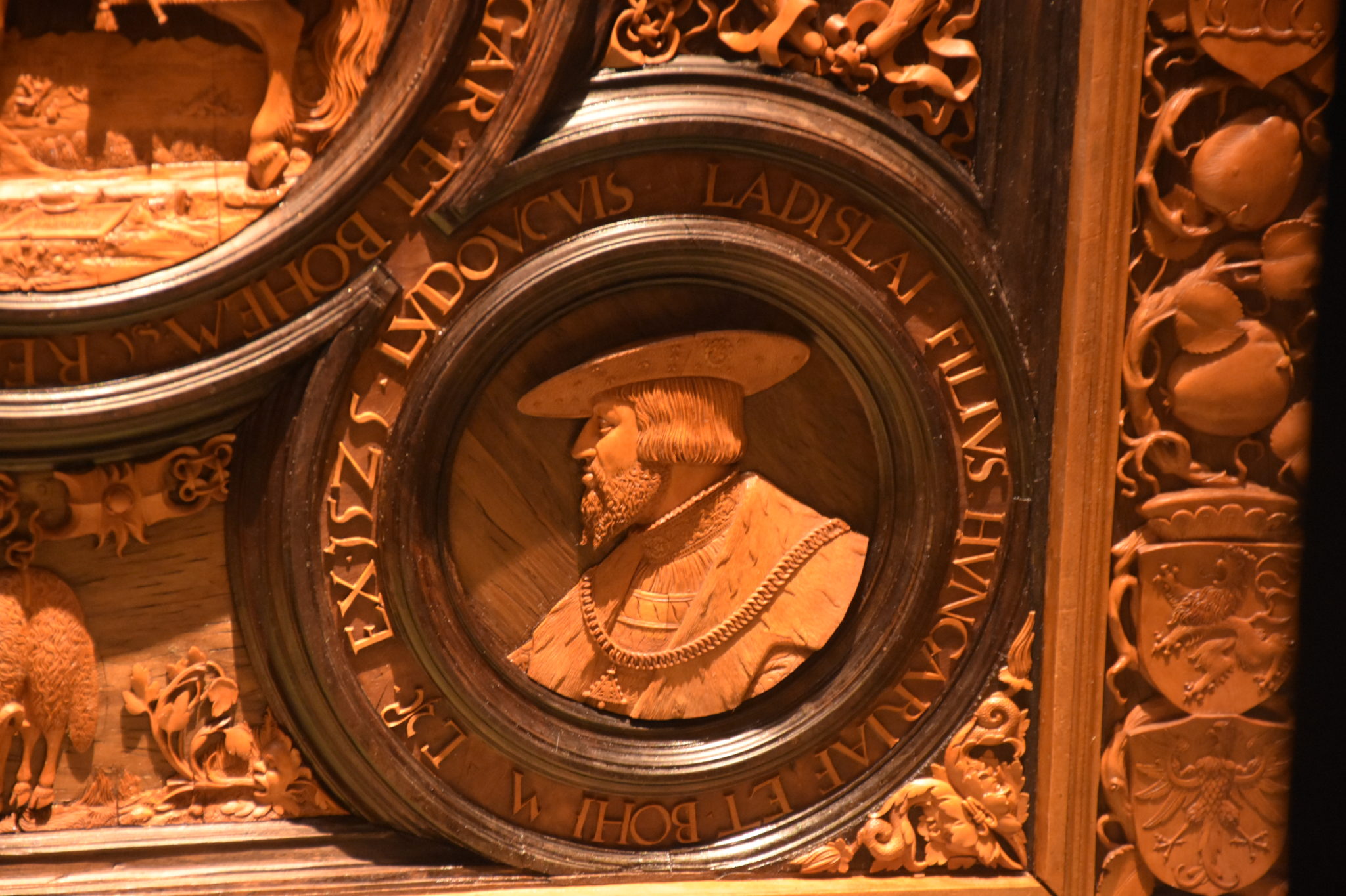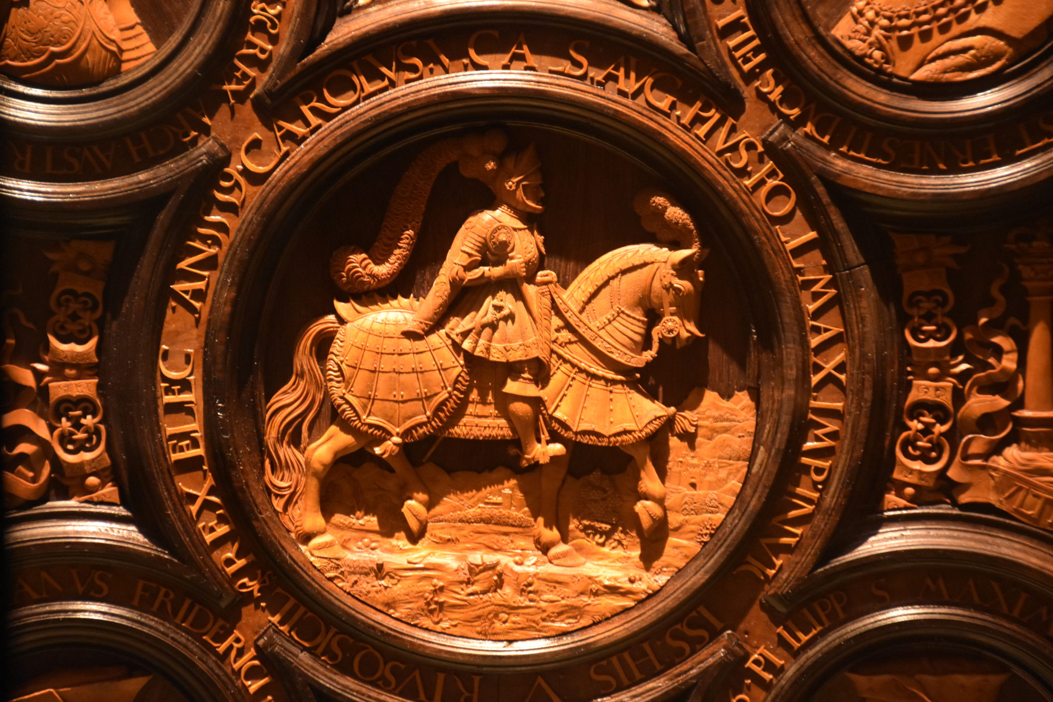 Die Schnitzereien der rechten Außenseite des Bretts sind in gleicher Weise angeordnet, nur widmen sie sich Ferdinands Bruder und Vorgänger als Kaiser des Reiches, Karl V.