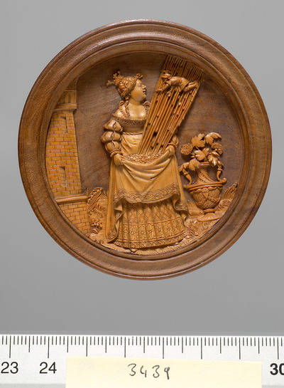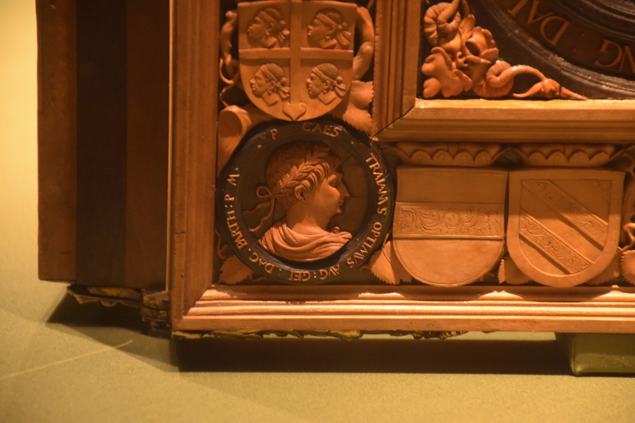 Eingefasst ist das Spiel mit Früchten, Blätter, Wappen der Besitzungen und in den Eckmedaillons sind die Herrscher der 4 großen Weltreiche abgebildet: Cyrus, der Perser, Ninus, der Assyrer, Alexander, der Grieche und Romulus, der Römer.