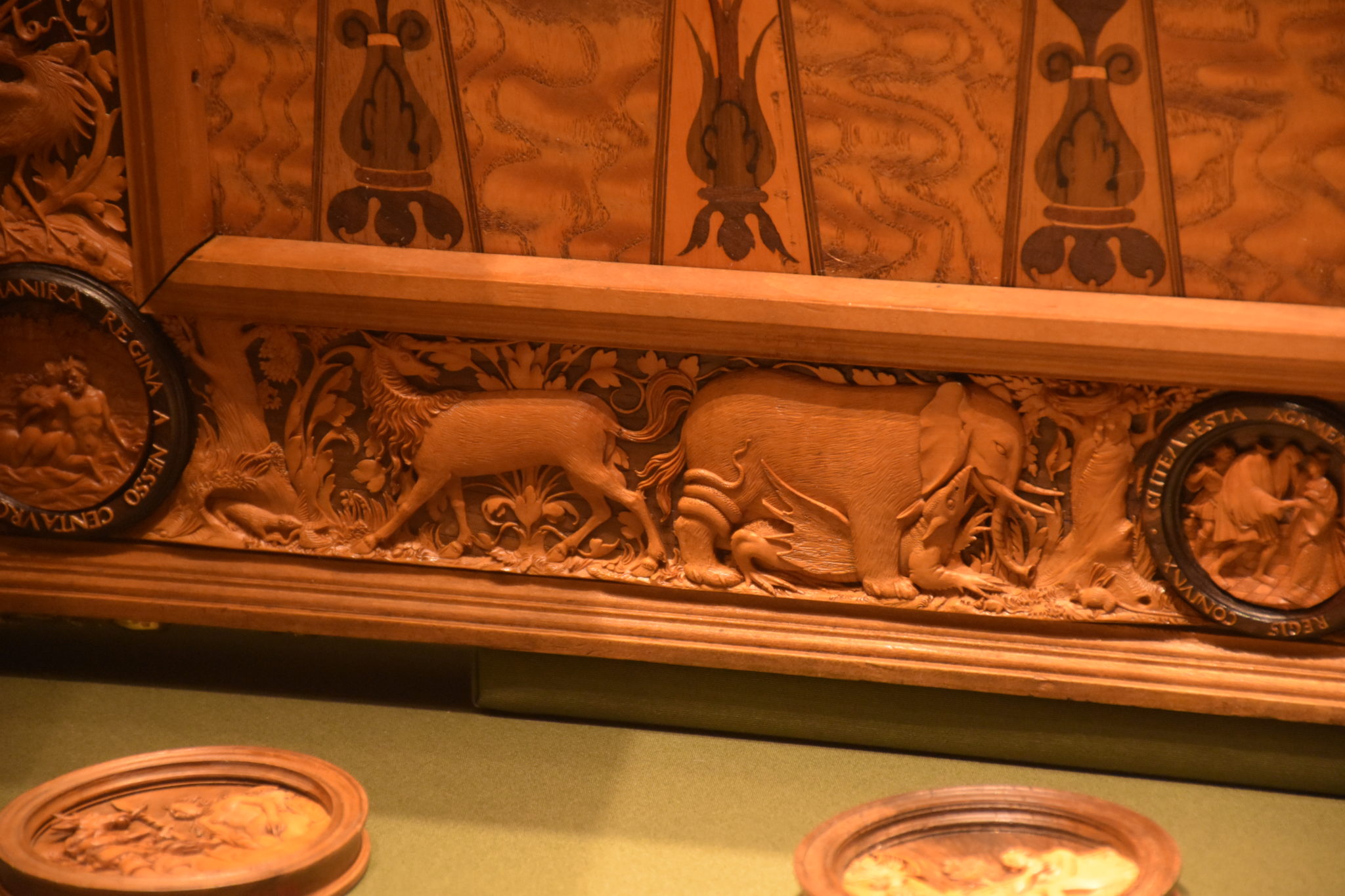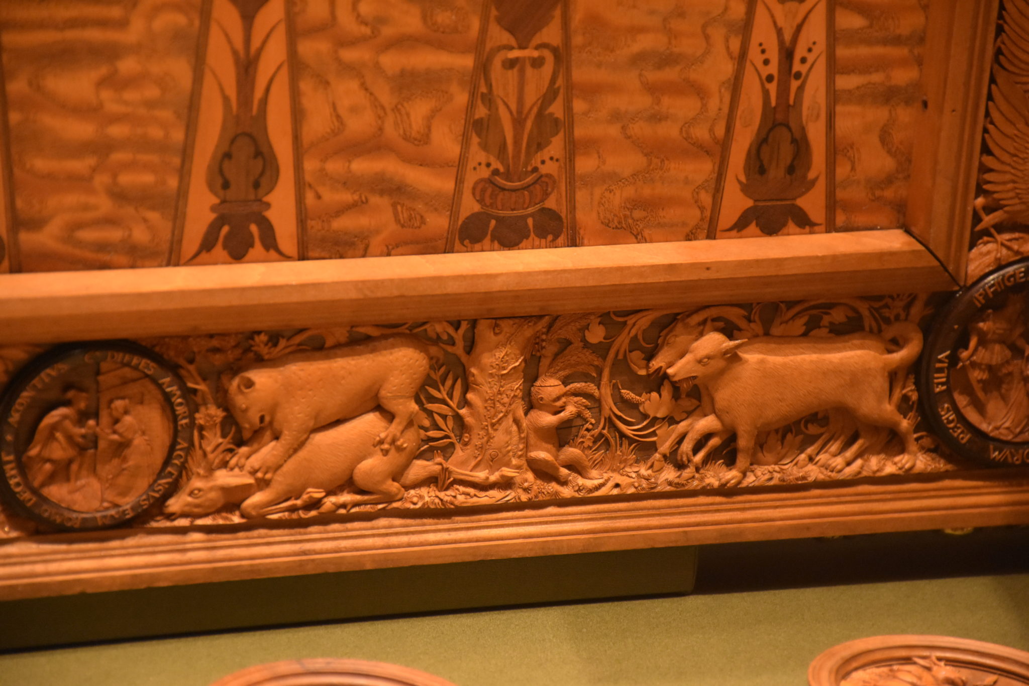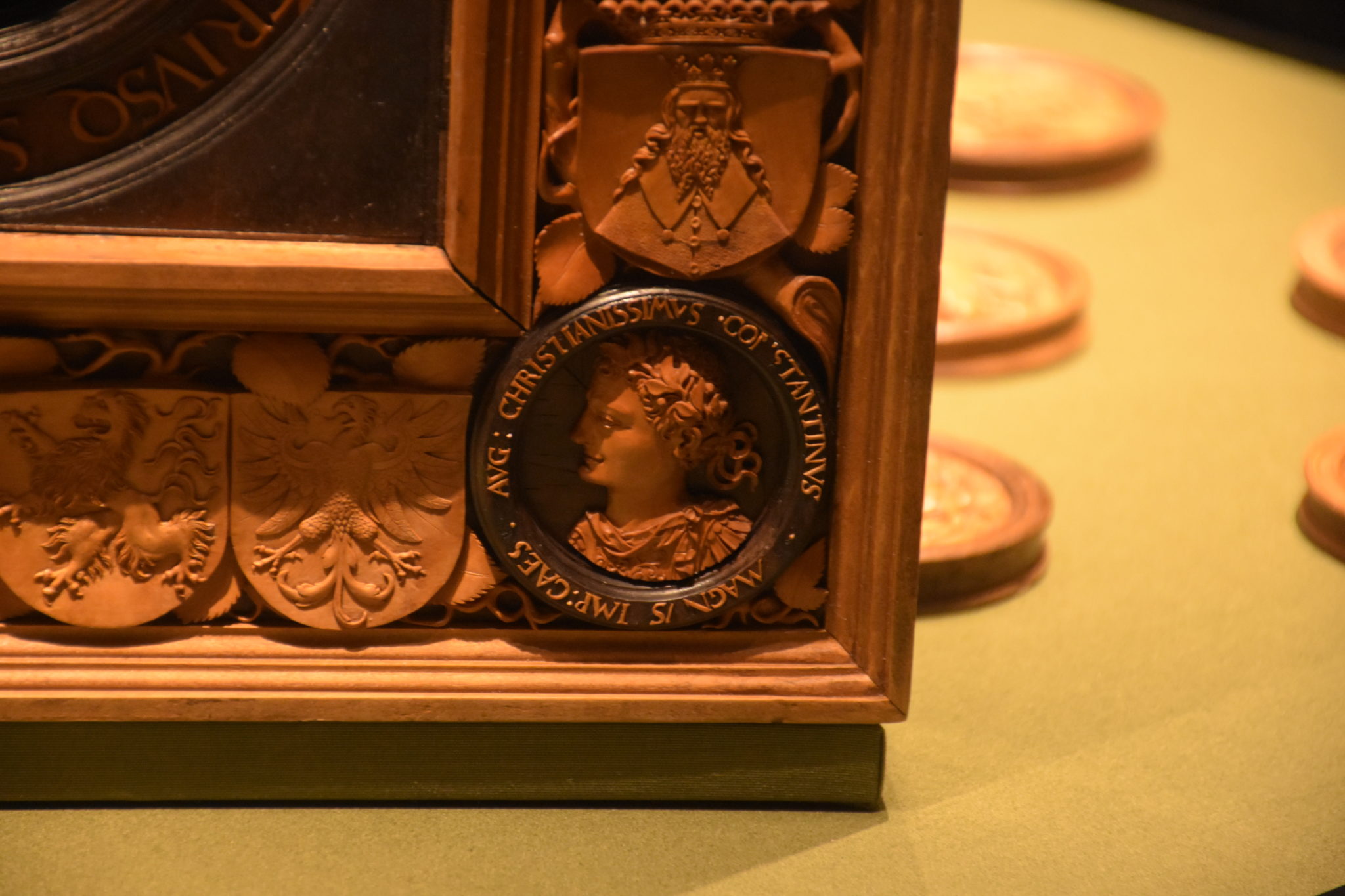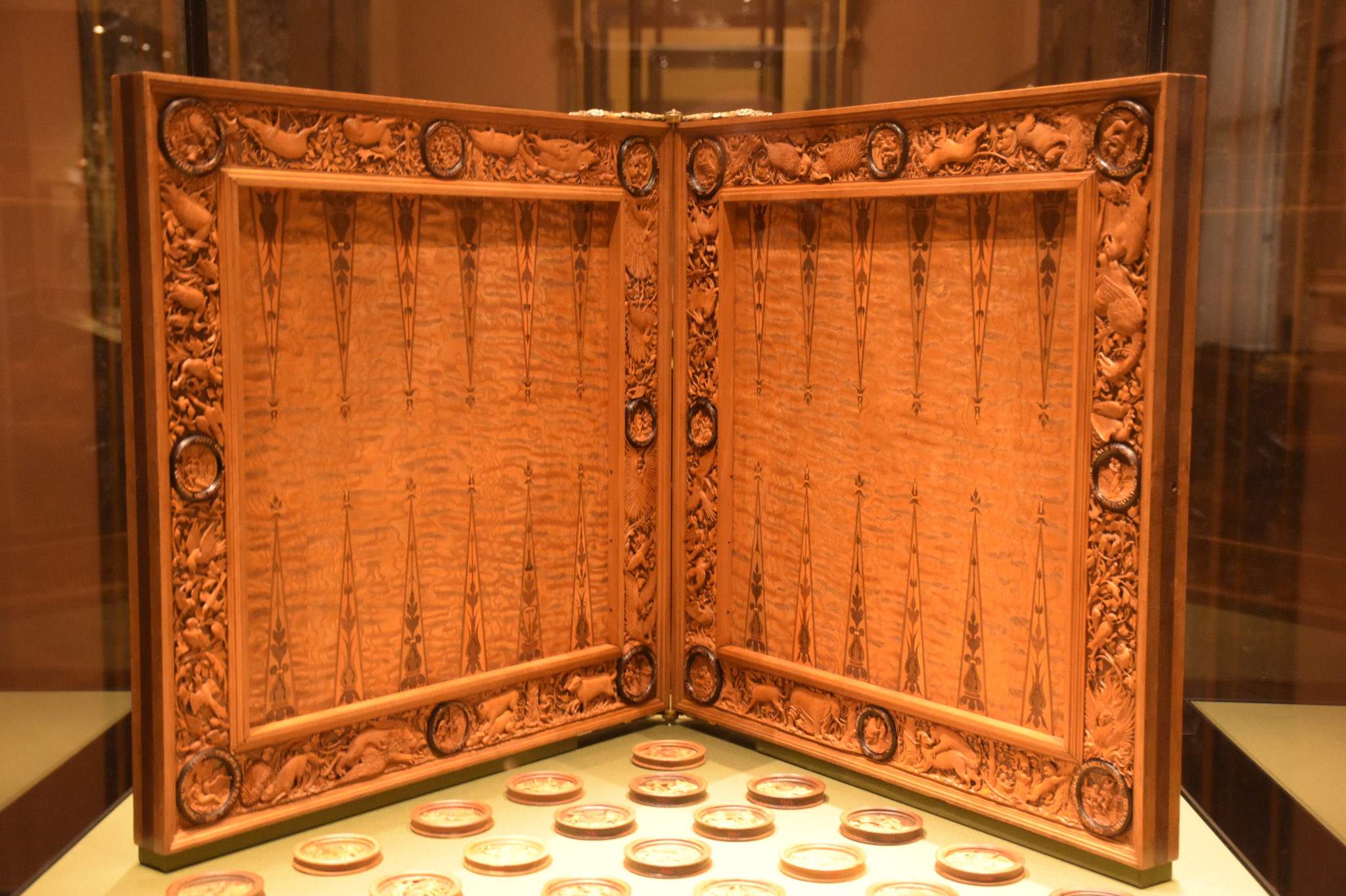 Und da auch Kaiser davon nicht ausgenommen waren, zeigt unser heutiges Kleinod ein Spiel aus dem Besitz des Habsburgers Ferdinand I. (1503-1564, Kaiser ab 1558). Es ist ein Vorläufer unseres „Back Gammon“, misst 56 cm im Quadrat und zeigt eine wundervolle Holzschnitzerei. Der ausführende Künstler war Hans Kels d. Ältere aus der bayrischen Stadt Kaufbeuren, und er hat es im Jahre 1537 signiert und datiert.
