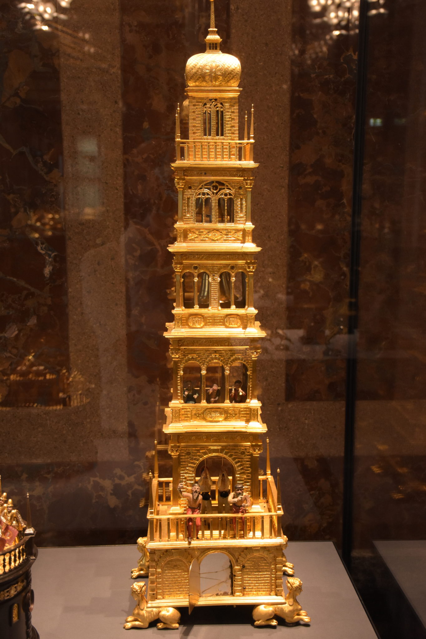 Das heutige Objekt unserer Freude, ist ein Automat in Form eines Glockenturms. Hergestellt wurde er aus feuervergoldeter Bronze durch den Augsburger Goldschmied und Uhrmacher Hans Schlottheim (1545-1625), der eine Reihe von Automaten für Sammler herstellte. Einen dieser erlesenen Stücke haben wir in unserem Kulturblog bereits vorgestellt: