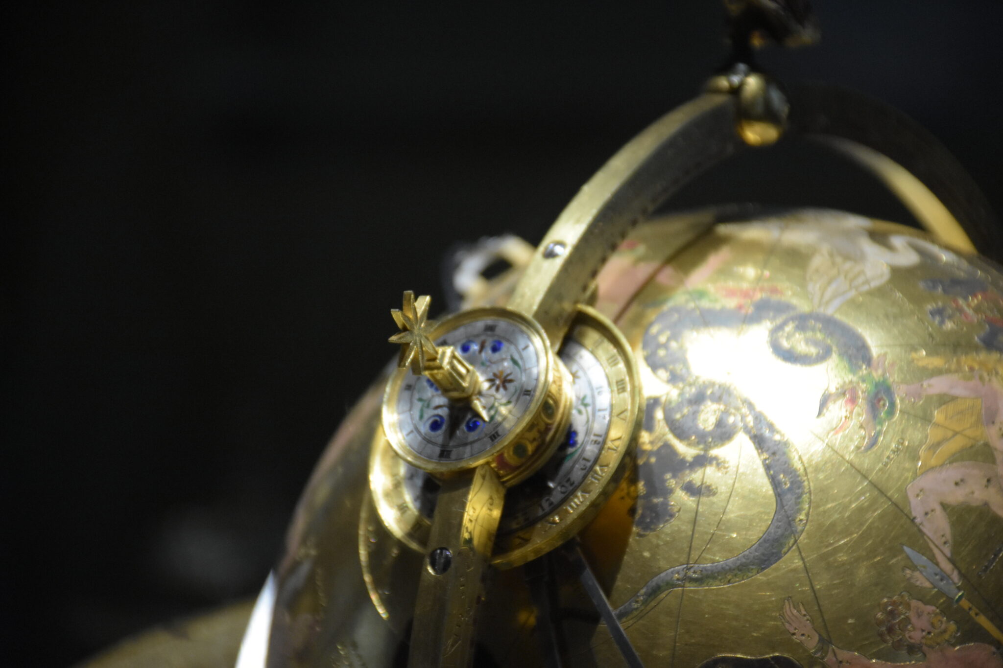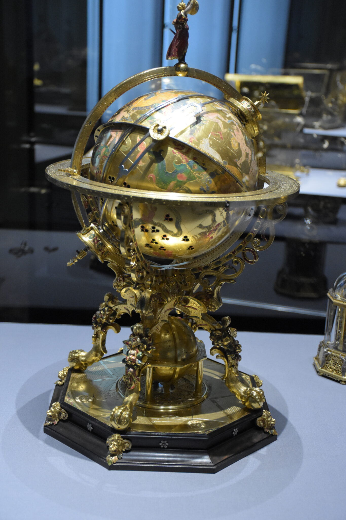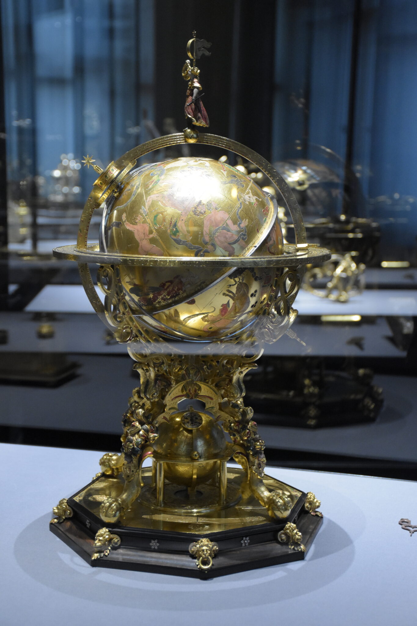 Insgesamt sind sechs Ausführungen dieses Modells heute bekannt, jedoch das hier gezeigte Wiener Exemplar ist durch seine Farbigkeit der Ausstattung das schmuckvollste. Dominiert wird die Erscheinung durch die Kugel des Globus, die 49 Sternbilder zeigt, an den schräg gestellten Polen befestigt und dennoch drehbar ist.