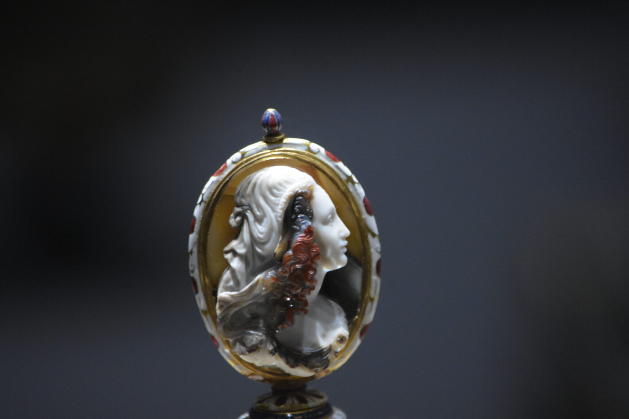 Für den krönenden Abschluss des Deckelbechers zeichnet ein Mailänder Unternehmen verantwortlich. Die Werkstatt der Steinschneider-Dynastie Miseroni schnitt Porträts in die exquisite Doppelkamee aus Achat. Die Familie Miseroni erarbeitete sich in vier Generationen den Ruf zu den besten Kunsthandwerkern und Steinschneidern Europas zu gehören. Bereits Kaiser Maximilian II. (reg. 1564-1576) war stolzer Besitzer von mehr als 60 Arbeiten dieser begnadeten Meister ihres Fachs.