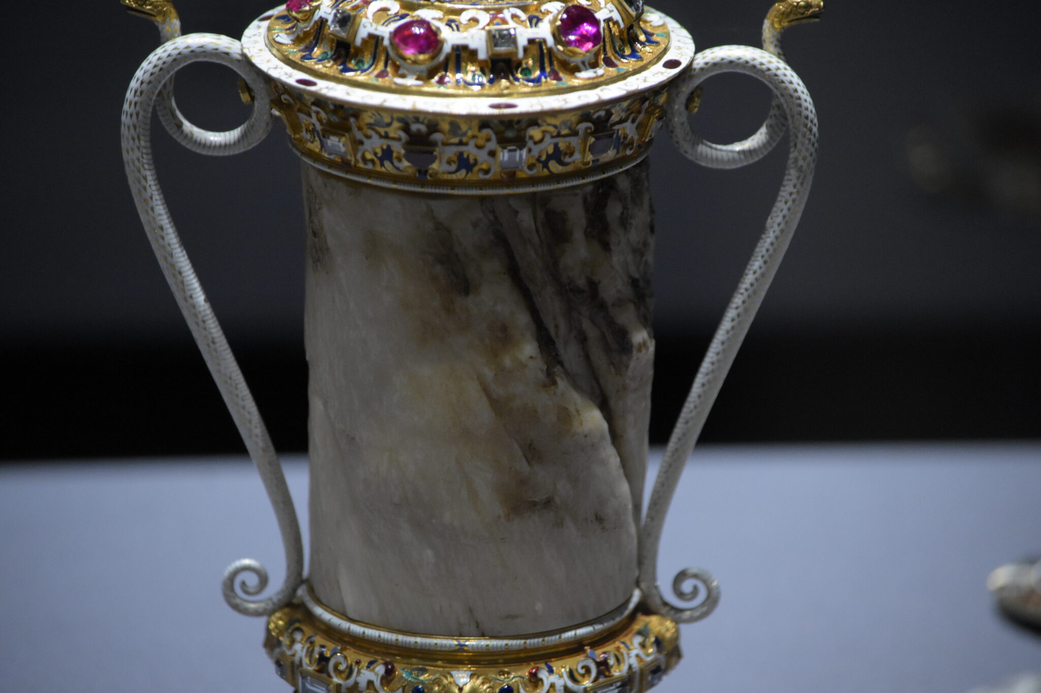 Der obere Teil der Fassung und der Deckel des Trinkgefäßes sind ähnlich und somit passend zum Sockel gestaltet, und beide zeigen das überragende Können des Goldschmiedes. Jan Vermeyen (1559-1606) avancierte zu einem der berühmtesten Handwerker seiner Zunft und schuf für des Kaisers Tafel und Kunstkammer etliche Gefäße und Kleinode.