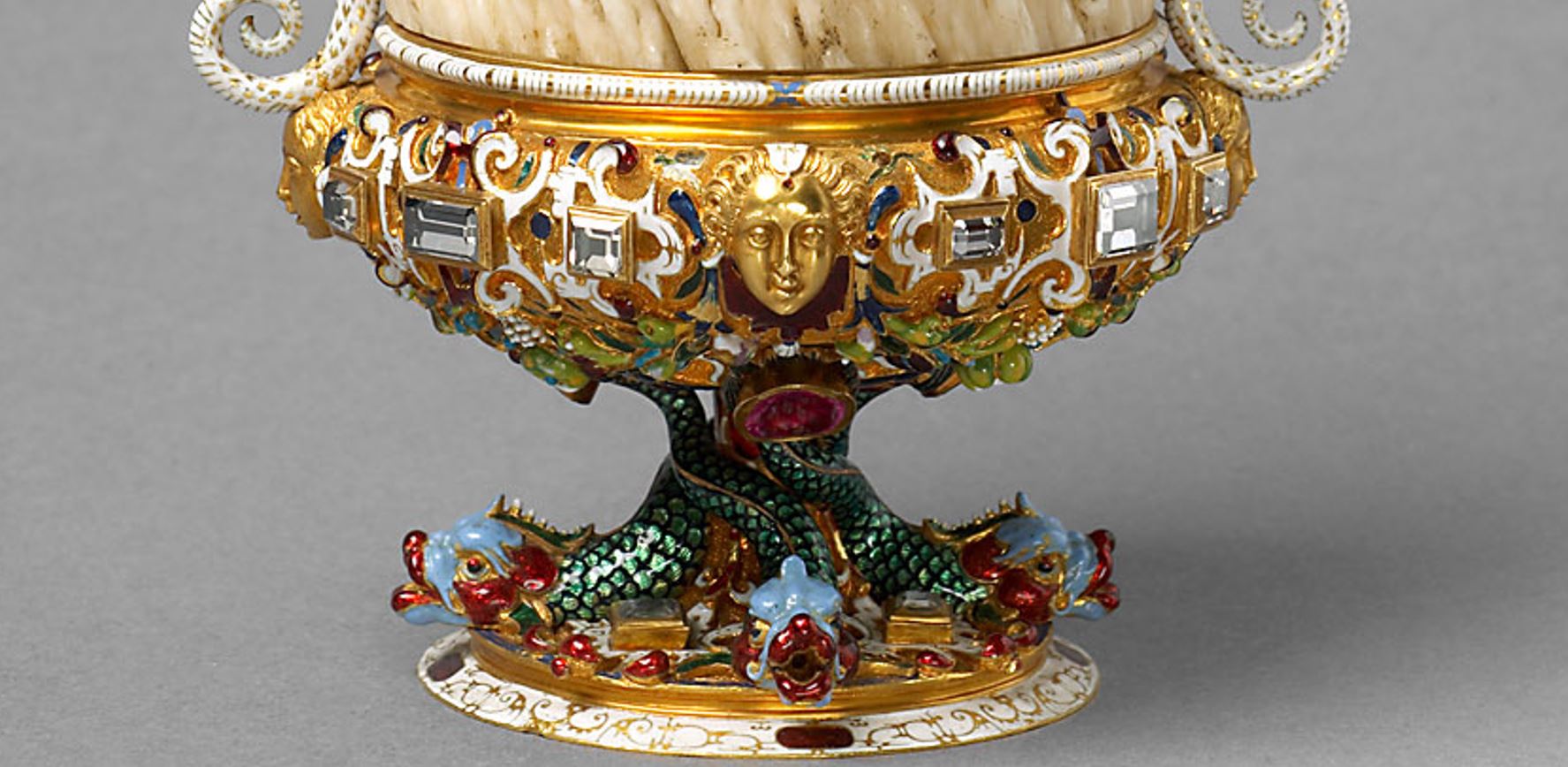 Um das Jahr 1600 beauftragte Kaiser Rudolf II. (1552-1612) seinen Hof-Goldschmied Jan Vermeyen, welcher auch die Privatkrone des Herrschers verfertigte, ein Stück „Ainkhürn“ in einen exklusiven Trinkbecher zu fassen. Vermeyen ging ans Werk und nur die erlesensten Werkstoffe fanden Verwendung: Gold, Diamanten, Rubine, Elfenbein und Email. Getragen wird der Becher von vier bunt emaillierten, gewundenen Fischkörpern, die in einen edelsteinbesetzten Goldsockel mit vier Gesichtern übergehen.
