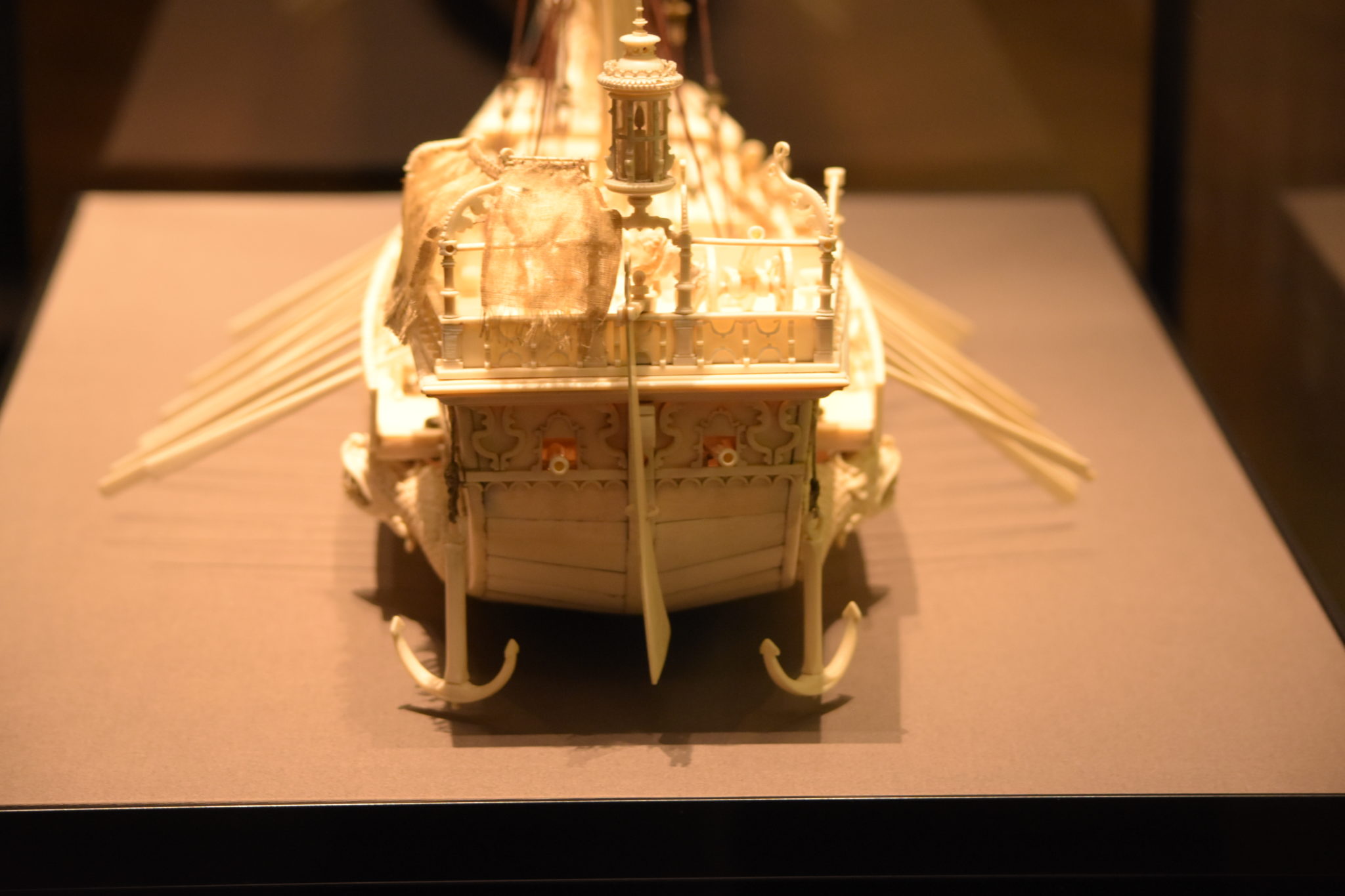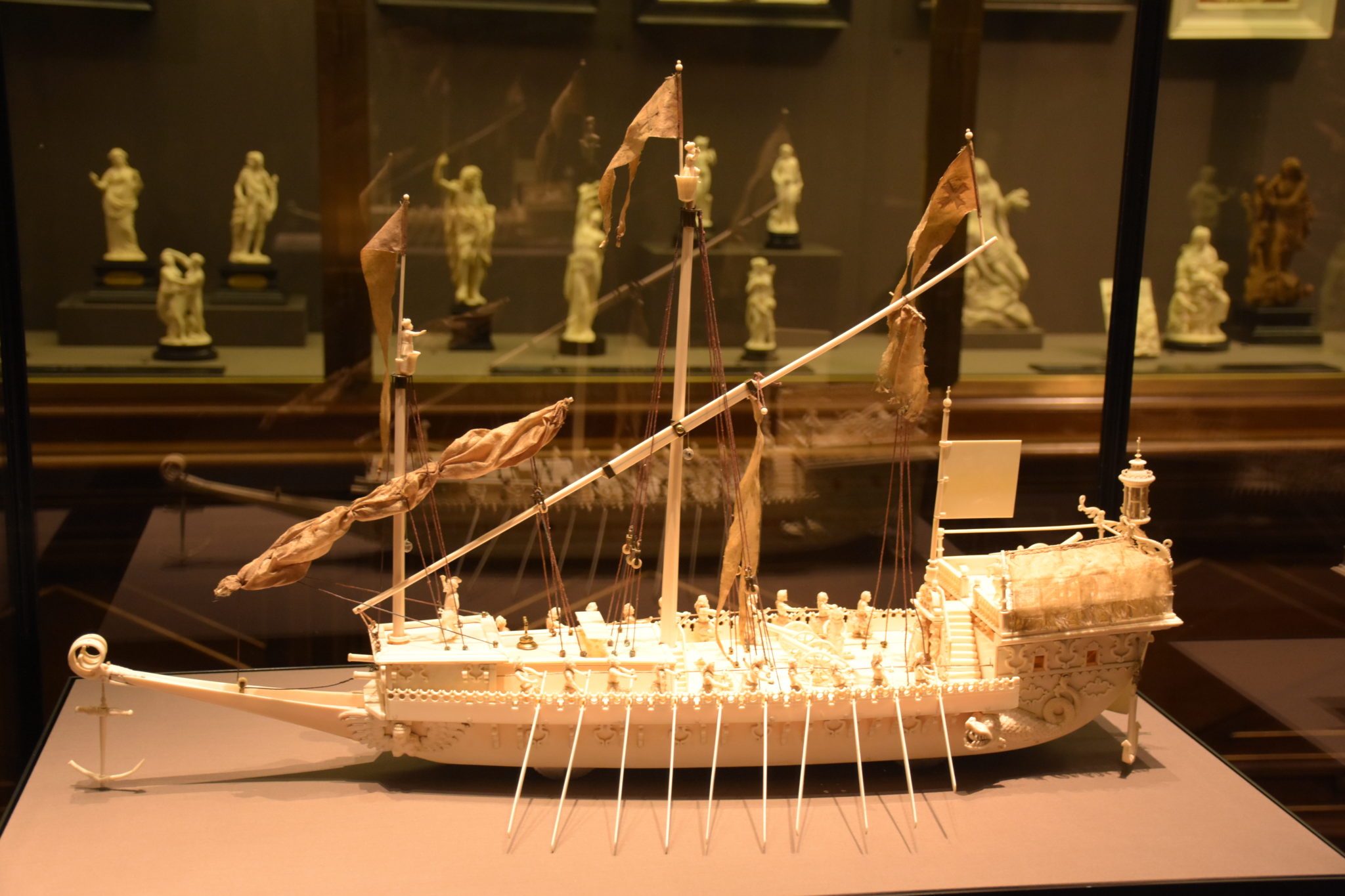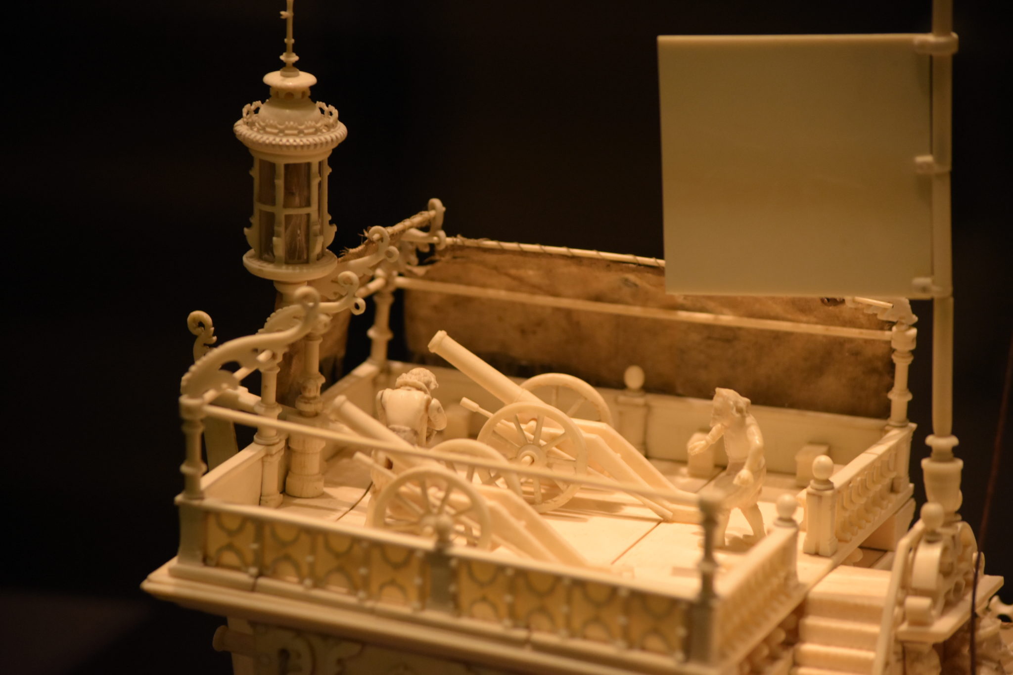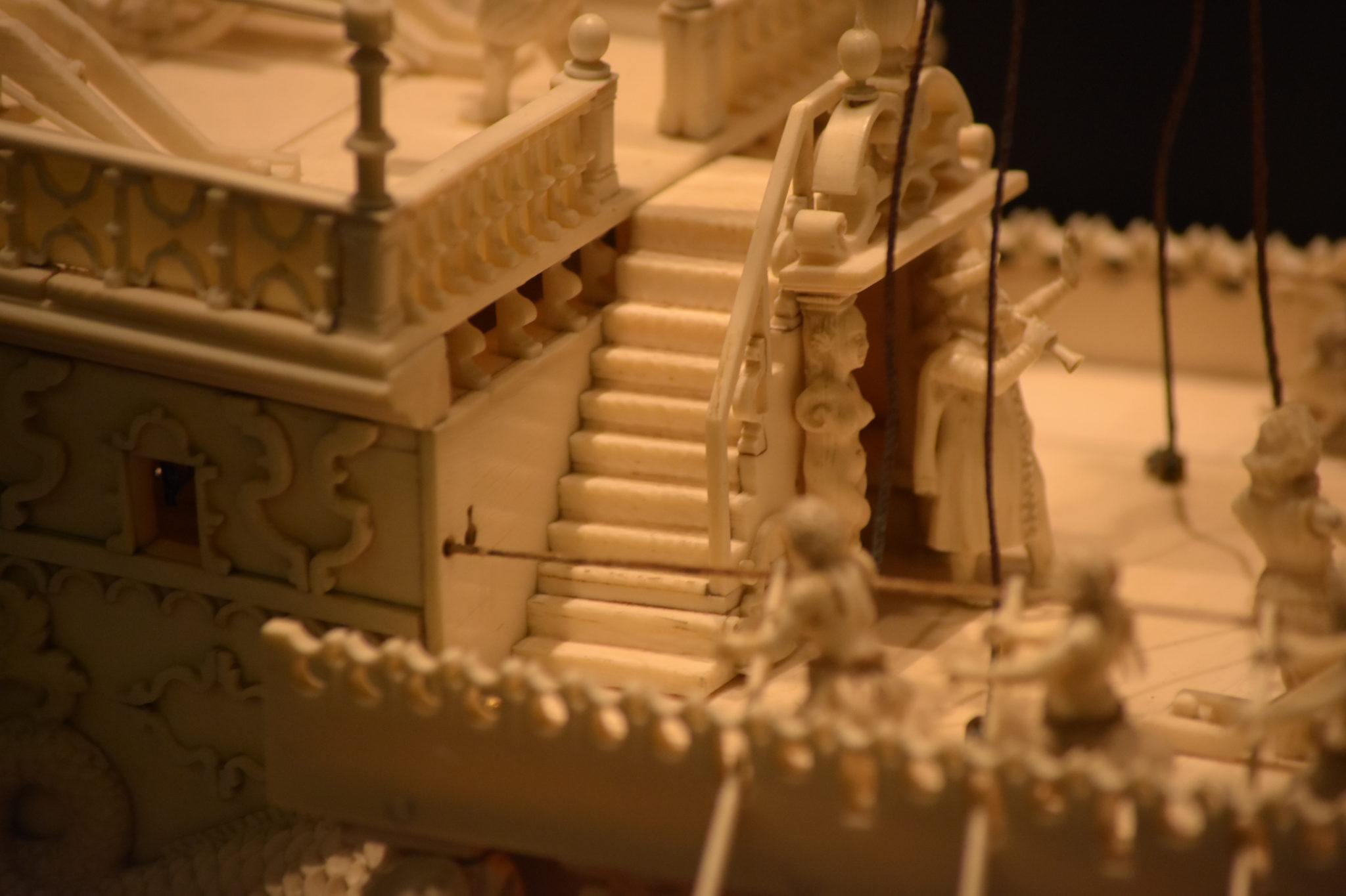 Das kostbare Stück besteht zum überwiegenden Teil aus Elfenbein und hat die Form einer Galeere mitsamt Besatzung. Mit 84cm Länge und fast 52cm Höhe sind die Ausmaße recht beachtlich.