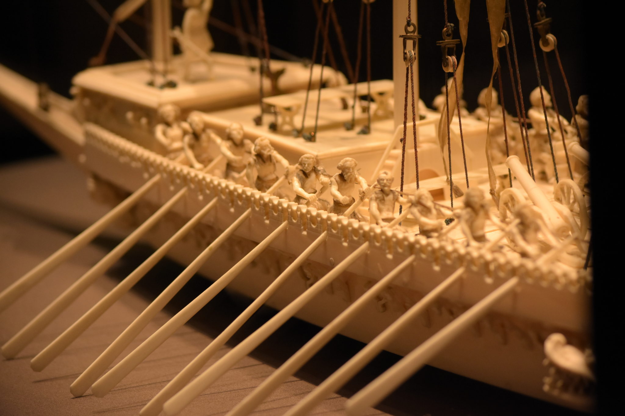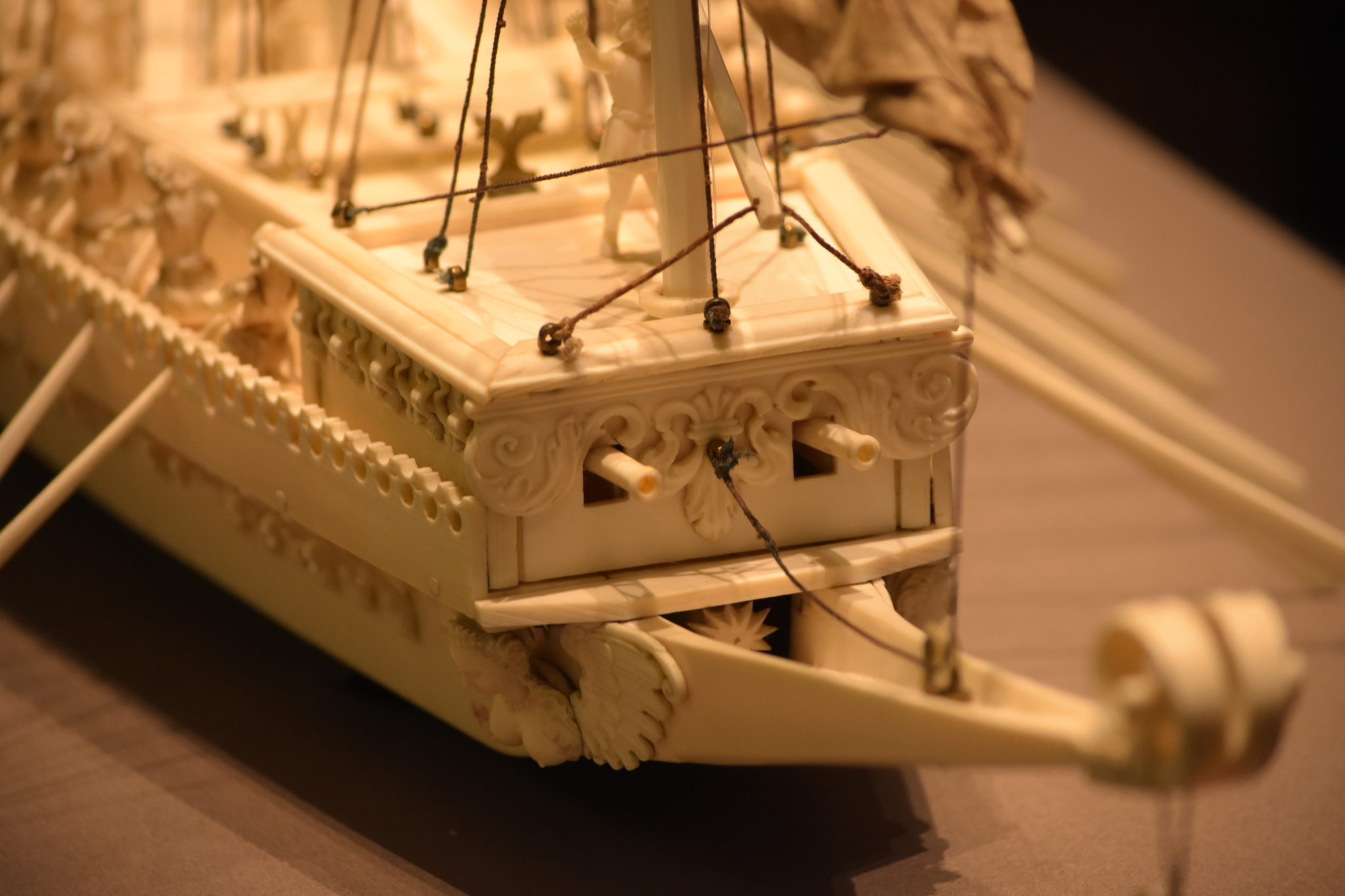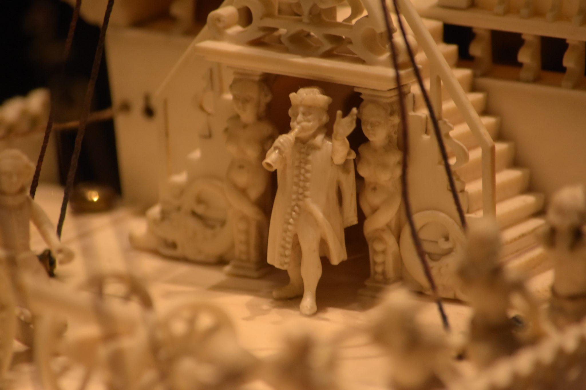 Das kostbare Stück besteht zum überwiegenden Teil aus Elfenbein und hat die Form einer Galeere mitsamt Besatzung. Mit 84cm Länge und fast 52cm Höhe sind die Ausmaße recht beachtlich.