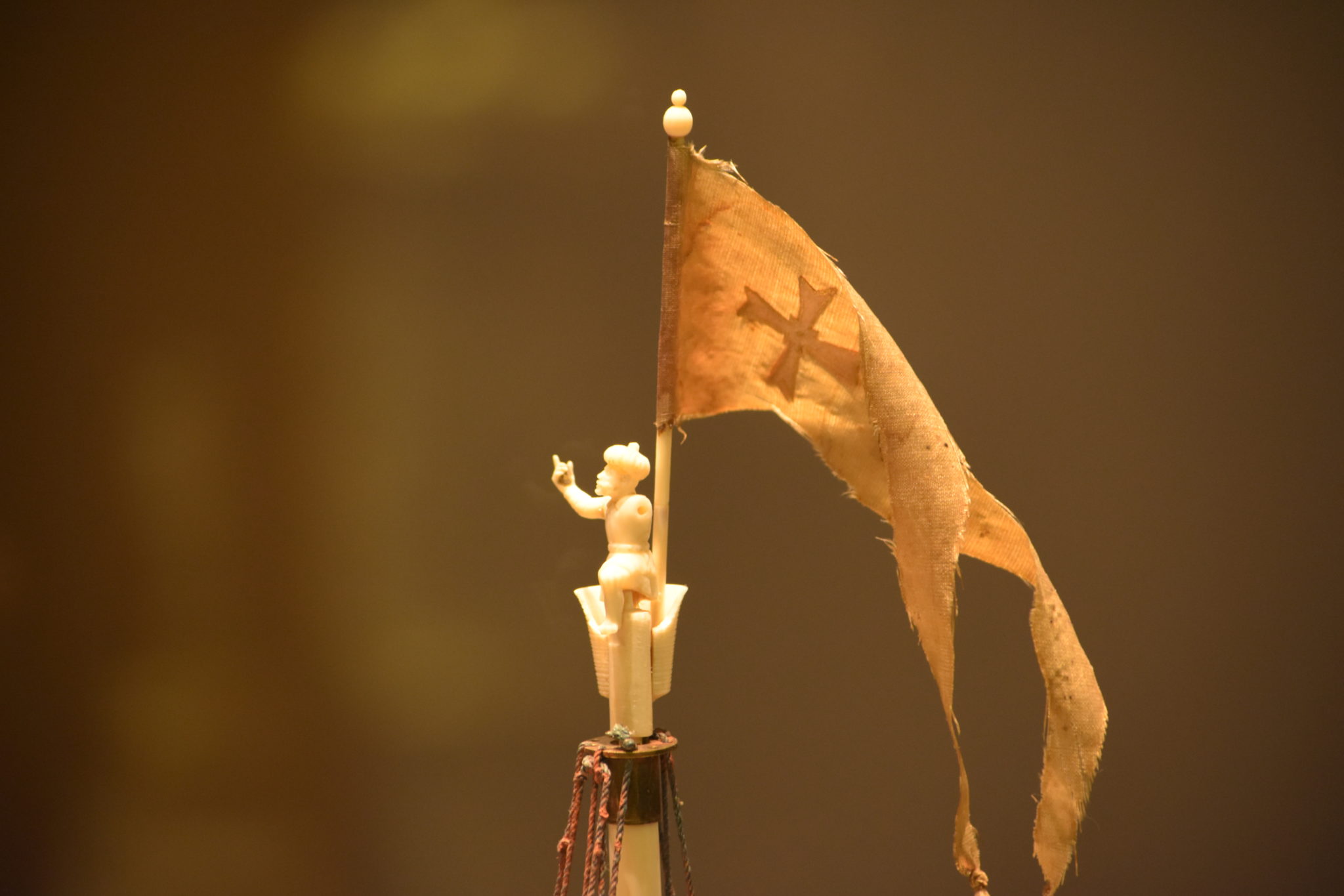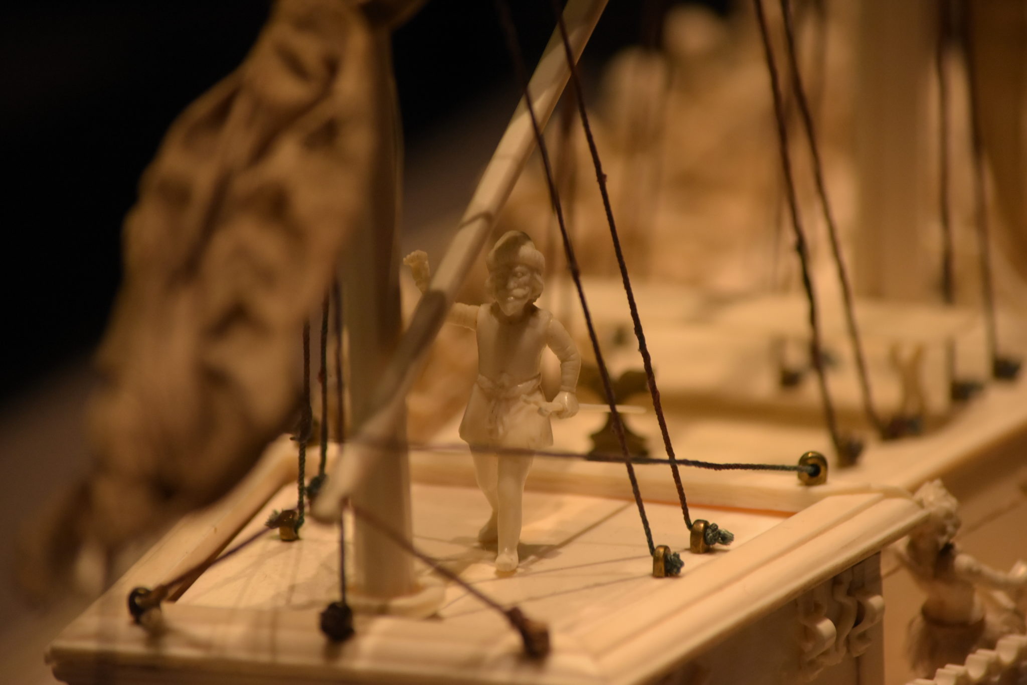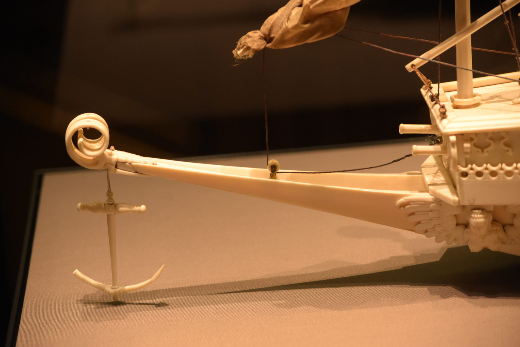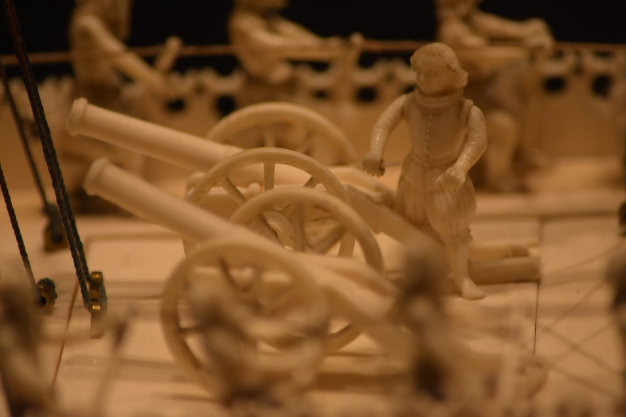 Das kostbare Stück besteht zum überwiegenden Teil aus Elfenbein und hat die Form einer Galeere mitsamt Besatzung. Mit 84cm Länge und fast 52cm Höhe sind die Ausmaße recht beachtlich.