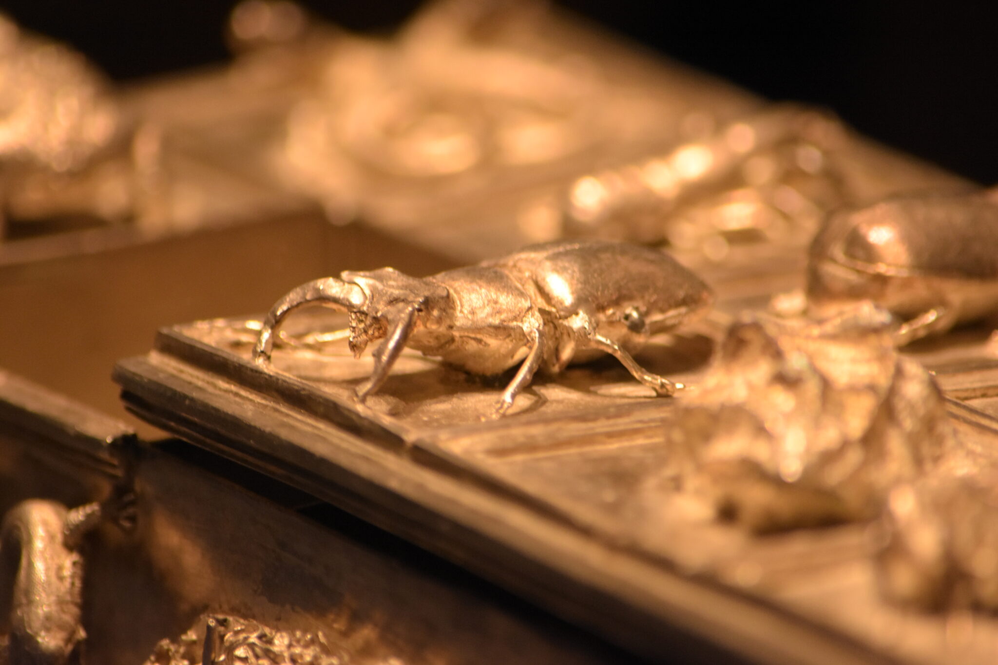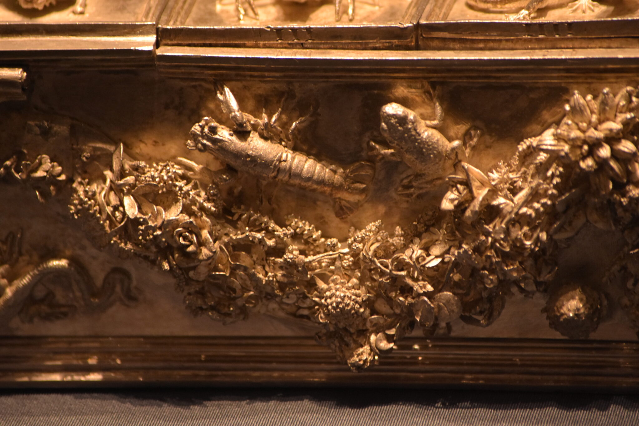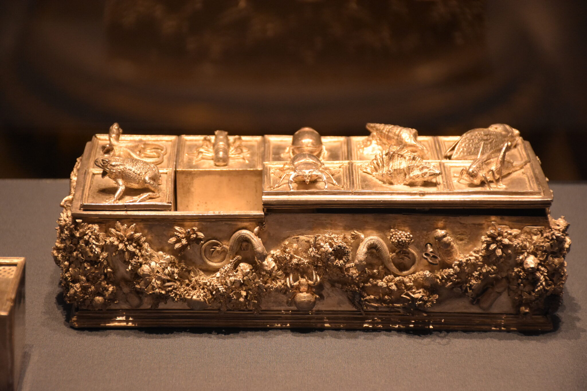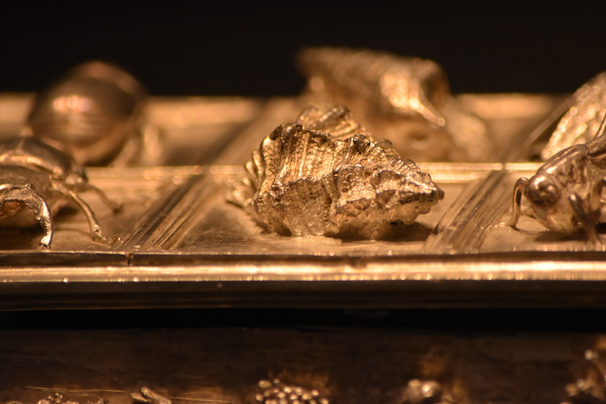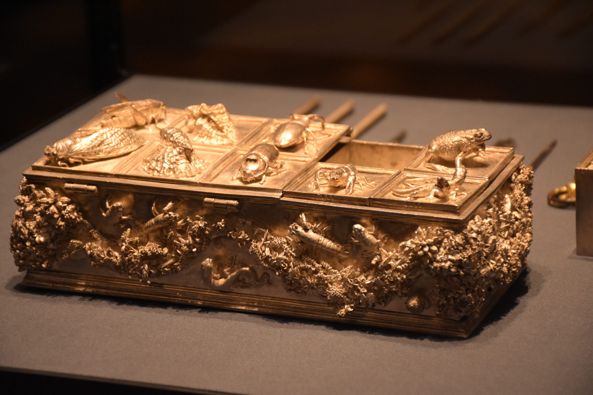 Die Besonderheit dieses Schreibzeugs liegt in der, zur Zeit der Renaissance sehr beliebten, Ausschmückung mit Tiermotiven. Die Oberseite der Kassette zieren Kleinlebewesen, wie Maus oder Frosch, aber auch Insekten und Bewohner des Meeres und sie wurden als Naturabguss hergestellt. Gleichzeitig ergab sich aus den kleinen Tierkörpern auch ein praktischer Zweck, denn sie erleichterten das Öffnen der Behälter.