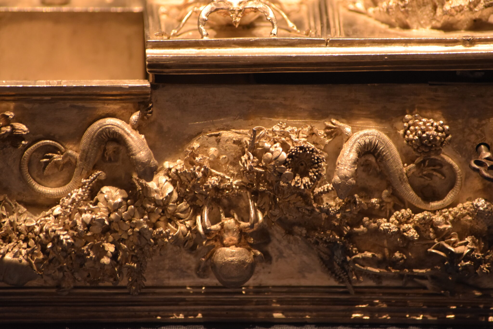 Der Korpus der Schatulle bezieht sich ebenfalls auf die Natur und ist überreich mit Pflanzen, Lebewesen und Blumen verziert. Dabei wurde eine sehr plastische Darstellungsweise angewandt und mit einer asymmetrischen Anordnung verknüpft, was zu einer sehr naturnahen Darstellung verhalf.