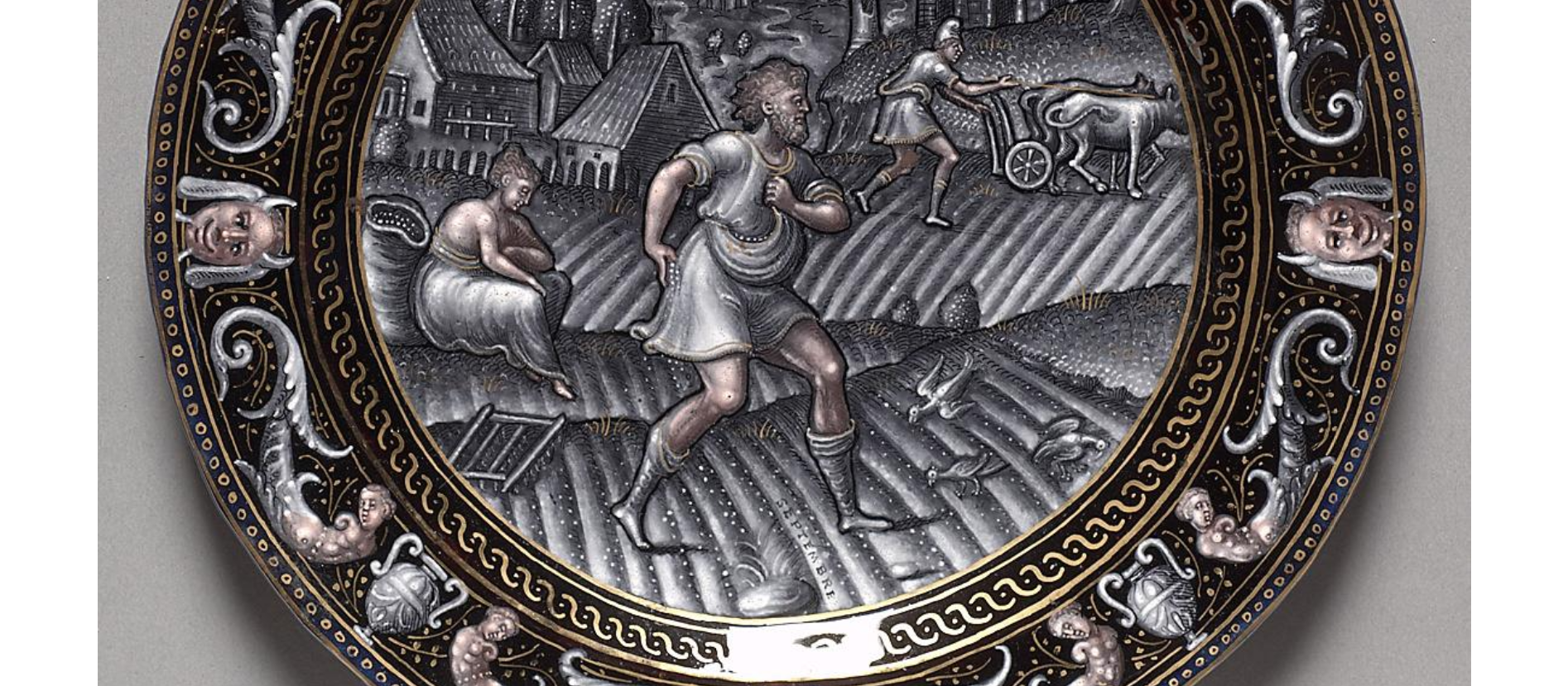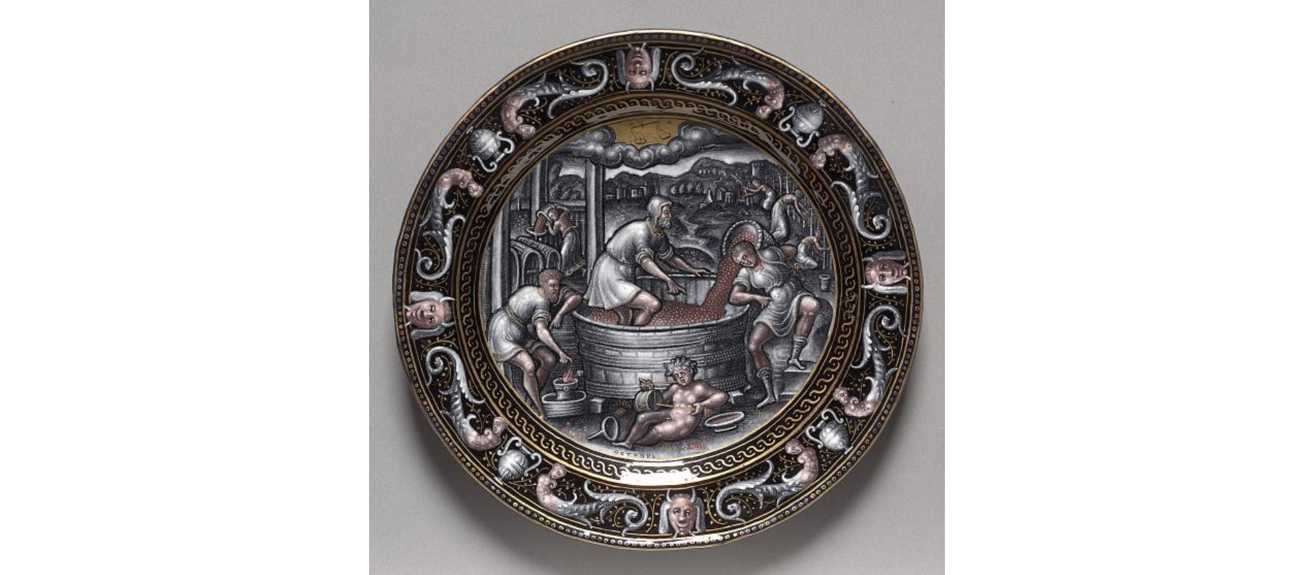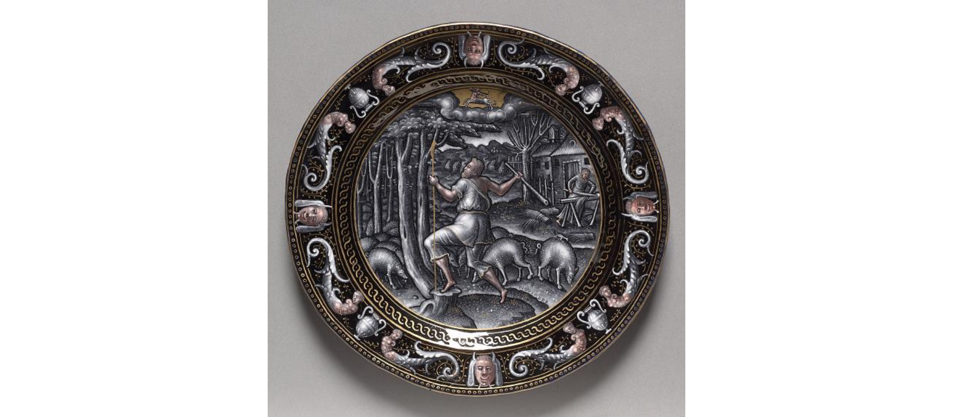 Der französische Kupferstecher Entienne Delaune (1519-1583) lieferte die Vorlagen für die Bemalung der emaillierten Kupferteller, die jeweils einen Durchmesser von 19,8 cm besitzen. Delaune schuf hunderte Zier- und Schmuckmotive von erlesener Qualität und technischer Präzision. Jahrelang arbeitete er immer wieder für das französische Königshaus bis er, zur Zeit der Bartholomäusnacht, Paris aus Sicherheitsgründen verließ.