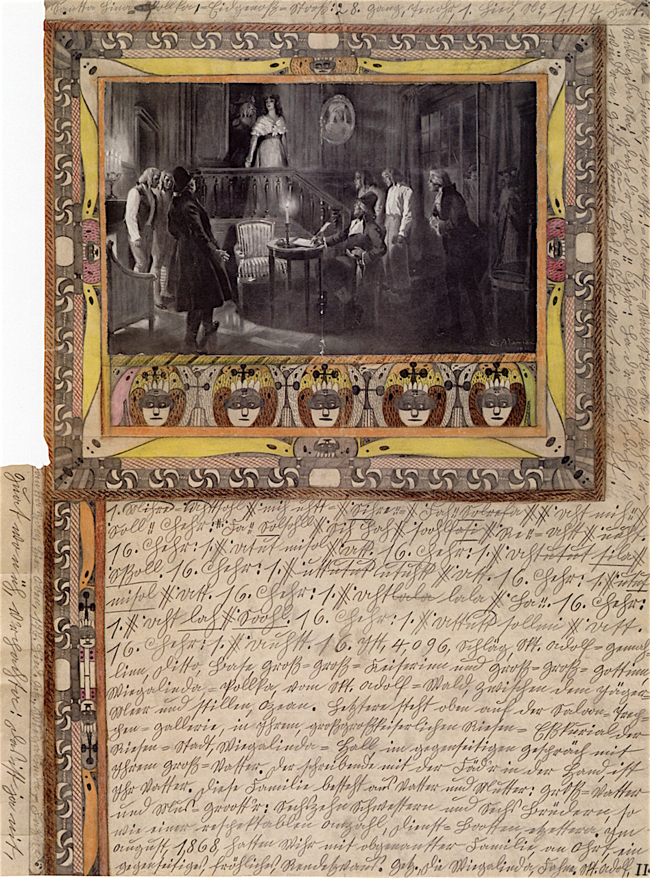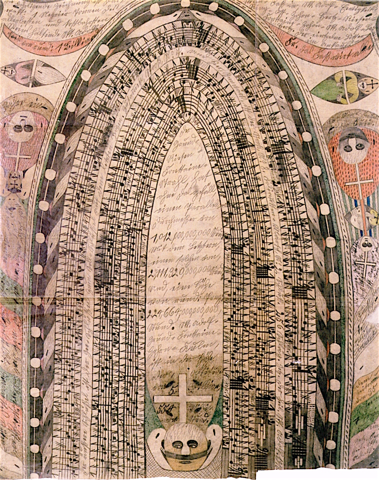 Die Notenbilder erinnern anfangs an normale Musikkompositionen, die jedoch später in Bewegung geraten und sich mäanderförmig entwickeln oder an Mandalas erinnern. Verblüffend daran ist, dass Musiker der Gegenwart sich daran versuchten, und es als sperrig aber vertonbar beurteilten. Ab 1915 schmückt Adolf seine Blätter,zwischen den Notenbändern, mit, aus Zeitungen ausgeschnittenen Bildern und schafft so seine ersten Collagen. Am Ende dieses Zyklus hat er seine ganze neue Welt erschaffen und er schließt mit Umbenennung der eigenen Person in „Skt. Adolf II.“.
