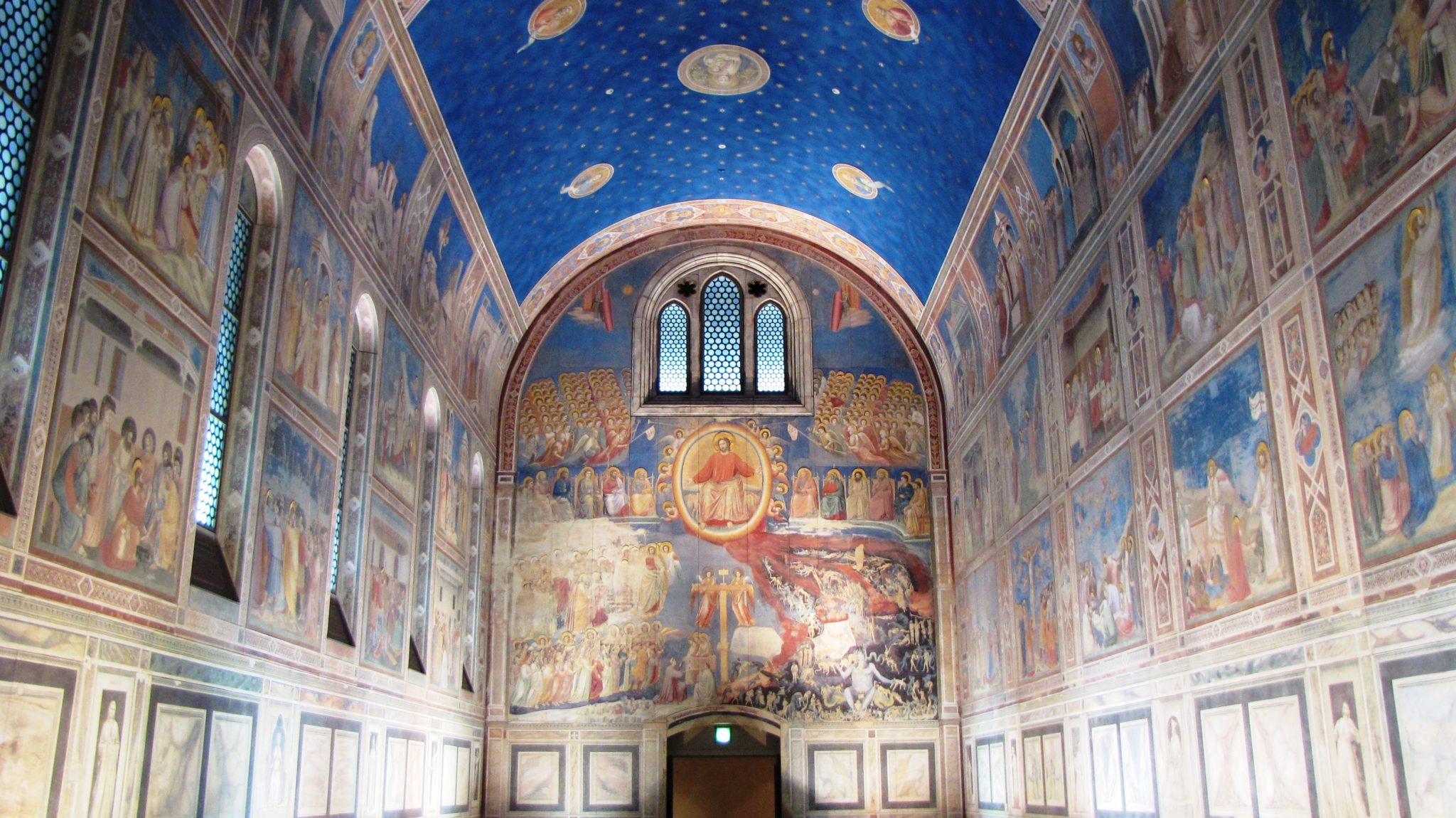 Und damit sind wir jetzt wirklich bei der „Cappella degli Scrovegni“! Diese wurde von ihm in den Jahren 1304 – 1306 mit einem Marien-Zyklus ausgestattet, der alle Wände mit Fresken bedeckt. Beginnend mit Joachim und Anna, den Eltern Marias, über der Gottesmutter eigenes Leben, bis hin zur Passion und dem Tod ihres Sohnes, zieht das Geschehen, in drei übereinander liegenden Bahnen chronologisch, an den Längsseiten der Kapelle, am Betrachter vorbei. Über dem Altarraum thront Gottvater und die Eingangswand ziert das Jüngste Gericht.