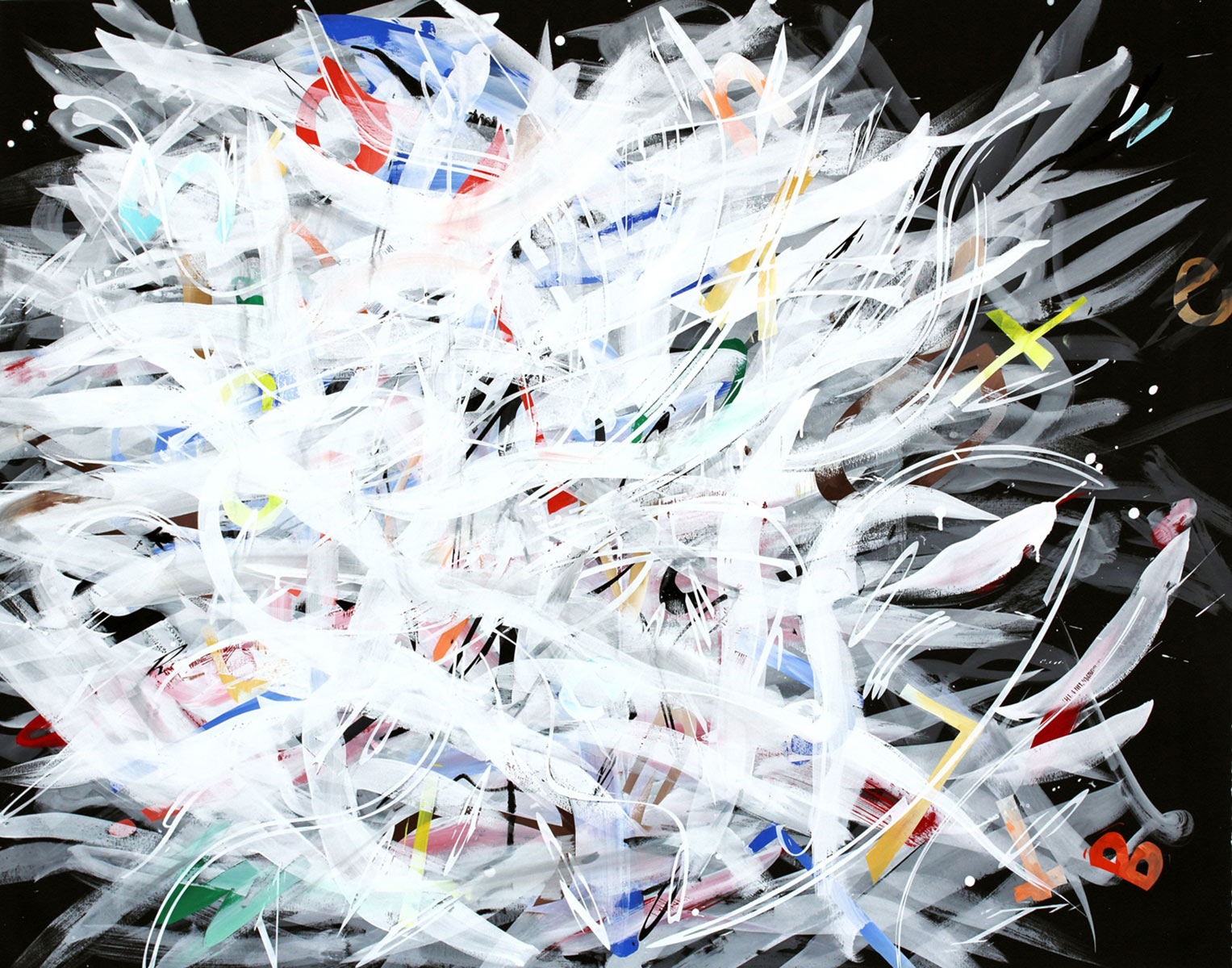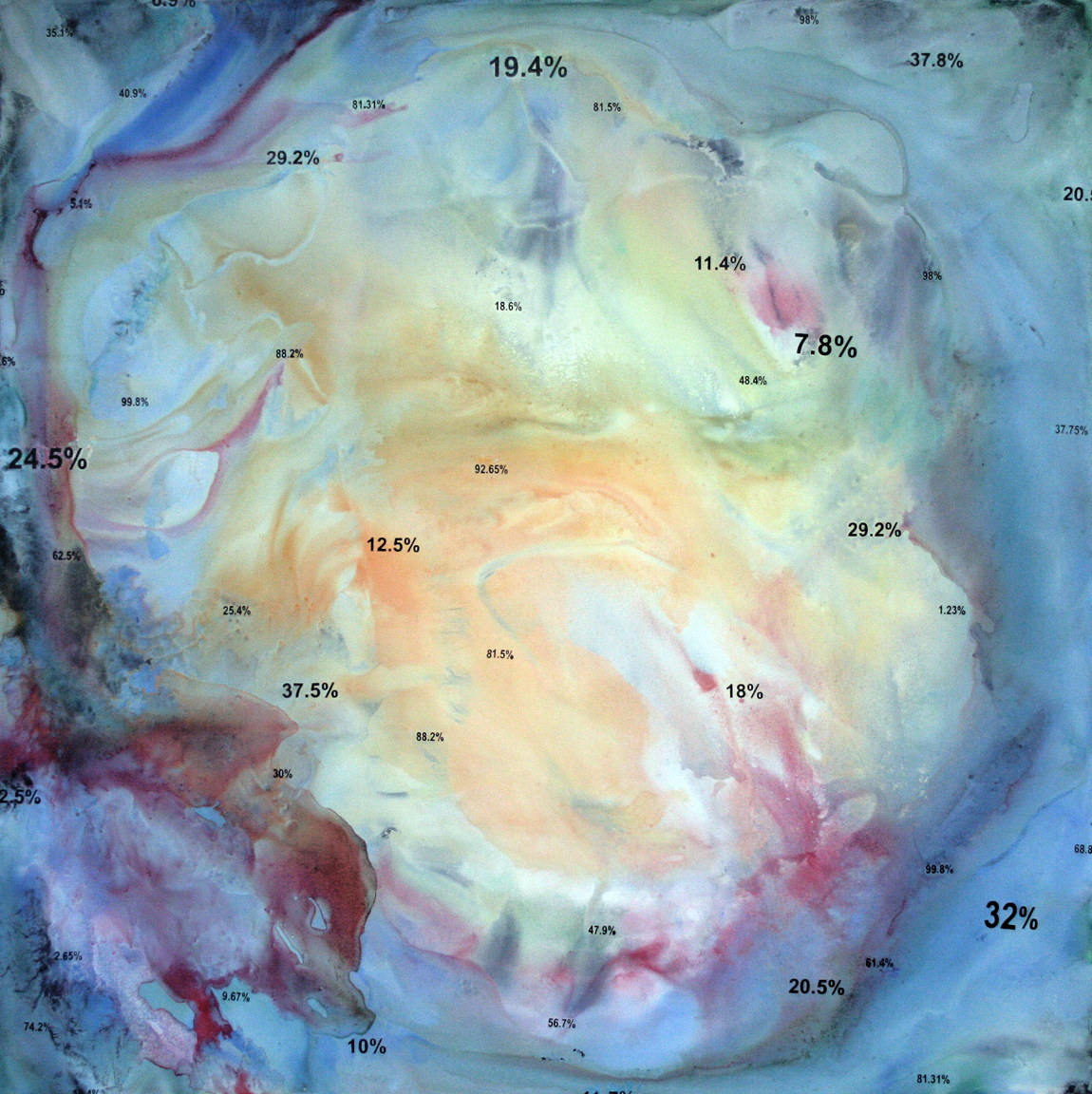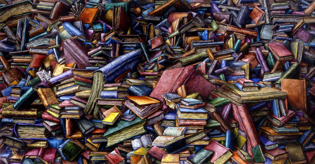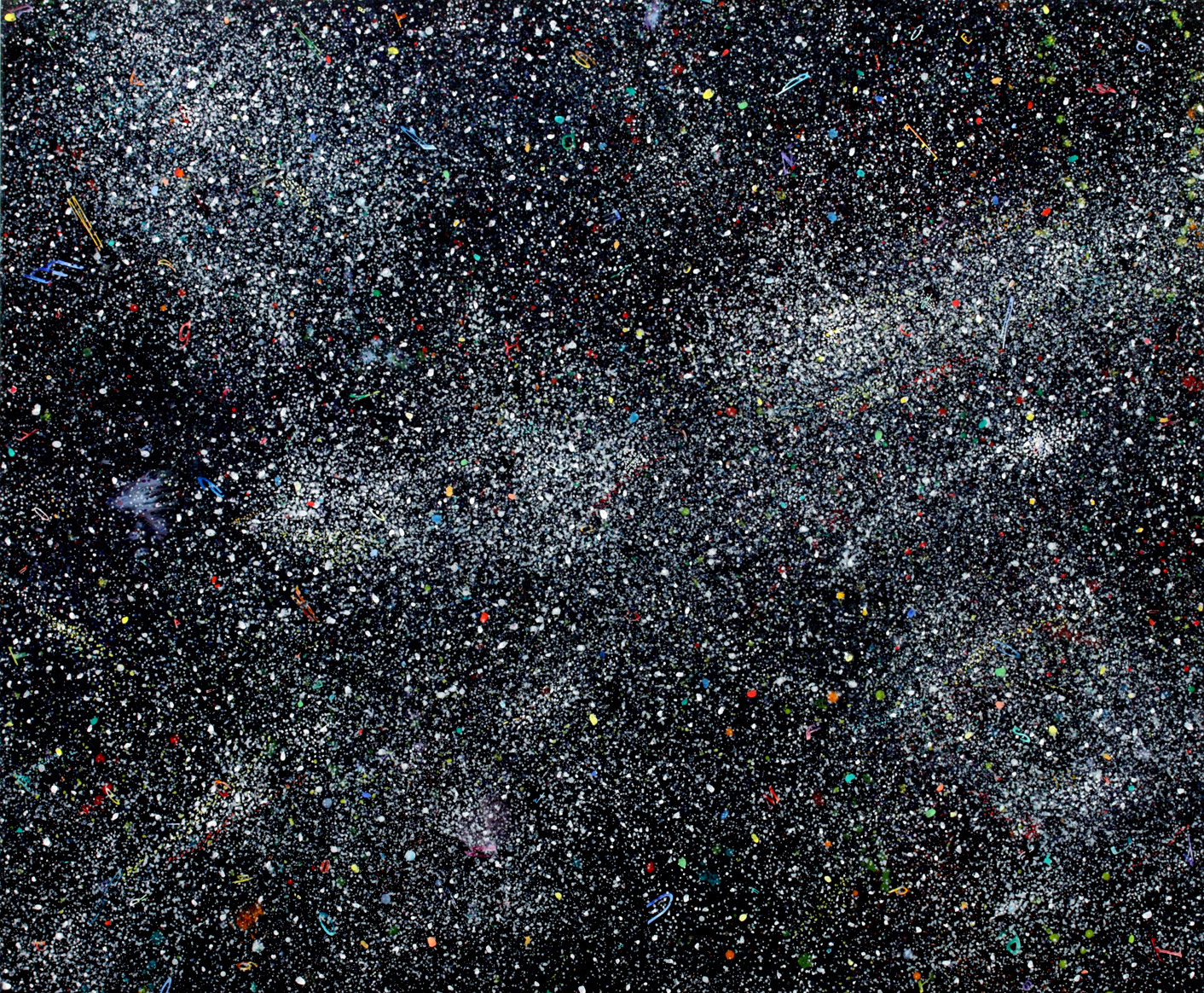 Dieser Urknall der Bücher funktioniert natürlich nicht mehr rein malerisch. Argue sucht ein Buch aus (z.B. Melvilles „Moby Dick“), verformt am Computer alle Buchstaben daraus und verteilt sie nach Belieben über die ganze Leinwand. Für den Betrachter erscheint es wie die Geburt eines neuen Universums. Da ich eine große Affinität zu Büchern habe,finde ich das sehr berührend, denn für mich ist jedes Buch eine eigene Welt.
