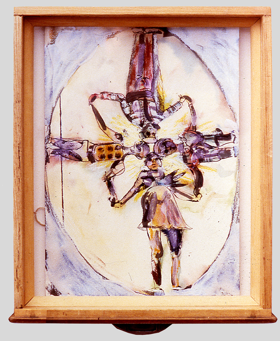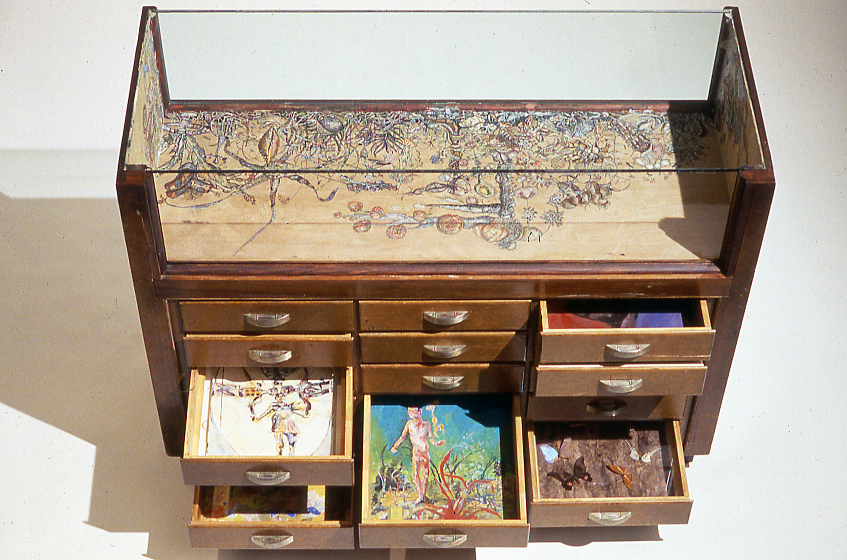 Ein interessantes Objekt aus 1989 stellt diese Schubladenkommode, wobei die Fächer als Malfläche dienen.