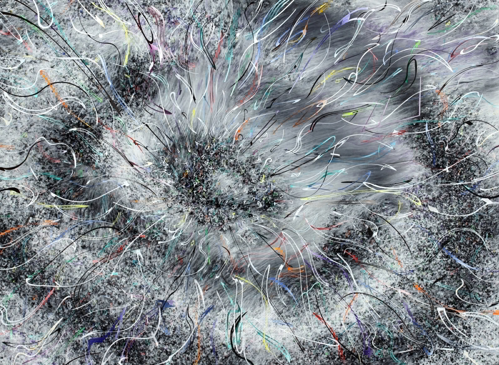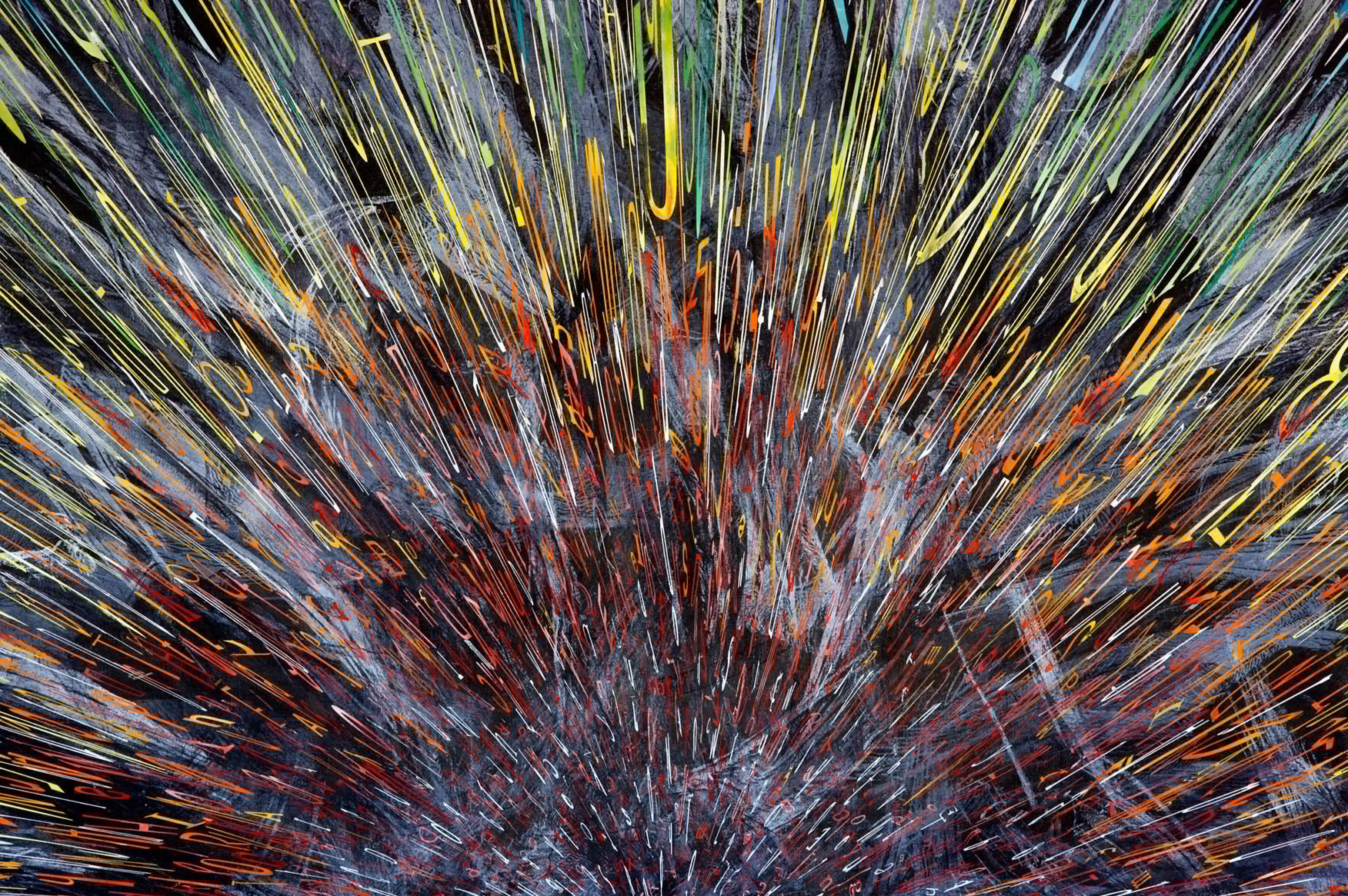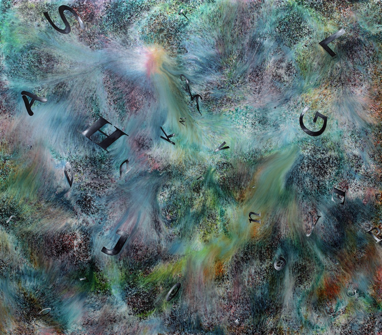 Und es kommt zu einer logischen Konsequenz: Wenn seine Bücher zerfallen, sich auflösen, implodieren, dann erstehen sie aufs Neue in einem Urknall aus Farbe und Buchstaben, wobei der Künstler, wie in seinem Gesamtwerk, das Großformat sehr schätzt.