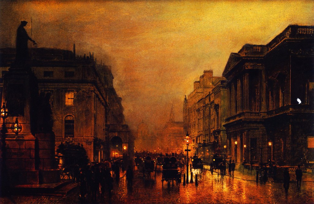Liebe Leute, mancher Betrachter wird die Bilder Grimshaws als bedrückend empfinden – Nacht, dunkle Palette, Einsamkeit, Stille- jedoch sie verkörpern den romantischen Geschmack des Viktorianischen Zeitalters. Sie sind die perfekte Ergänzung zum britischen Musikgeschmack dieser Zeit (Schubert, Brahms, Wagner..) und den damals äußerst populären Romanen von Charles Dickens.