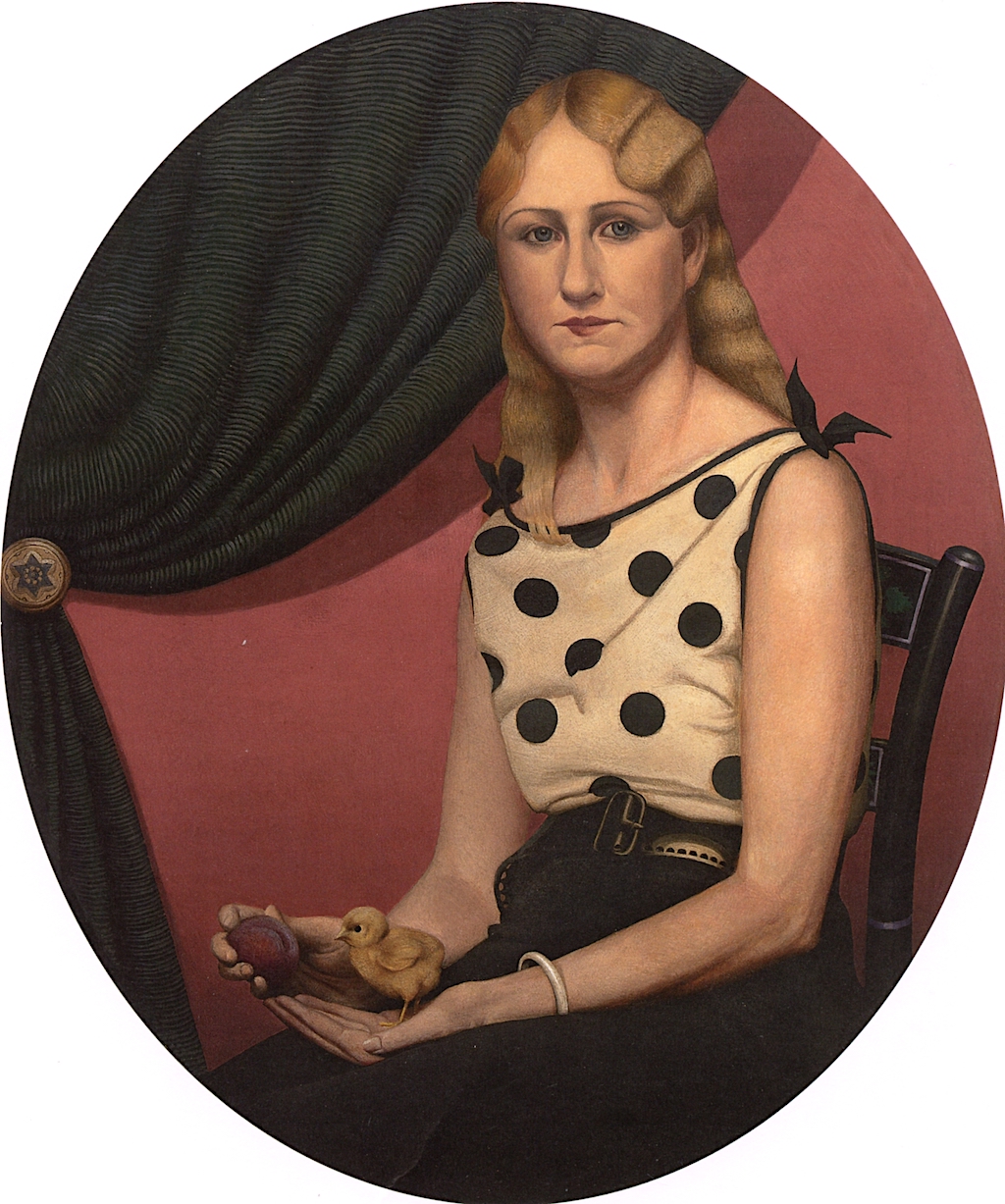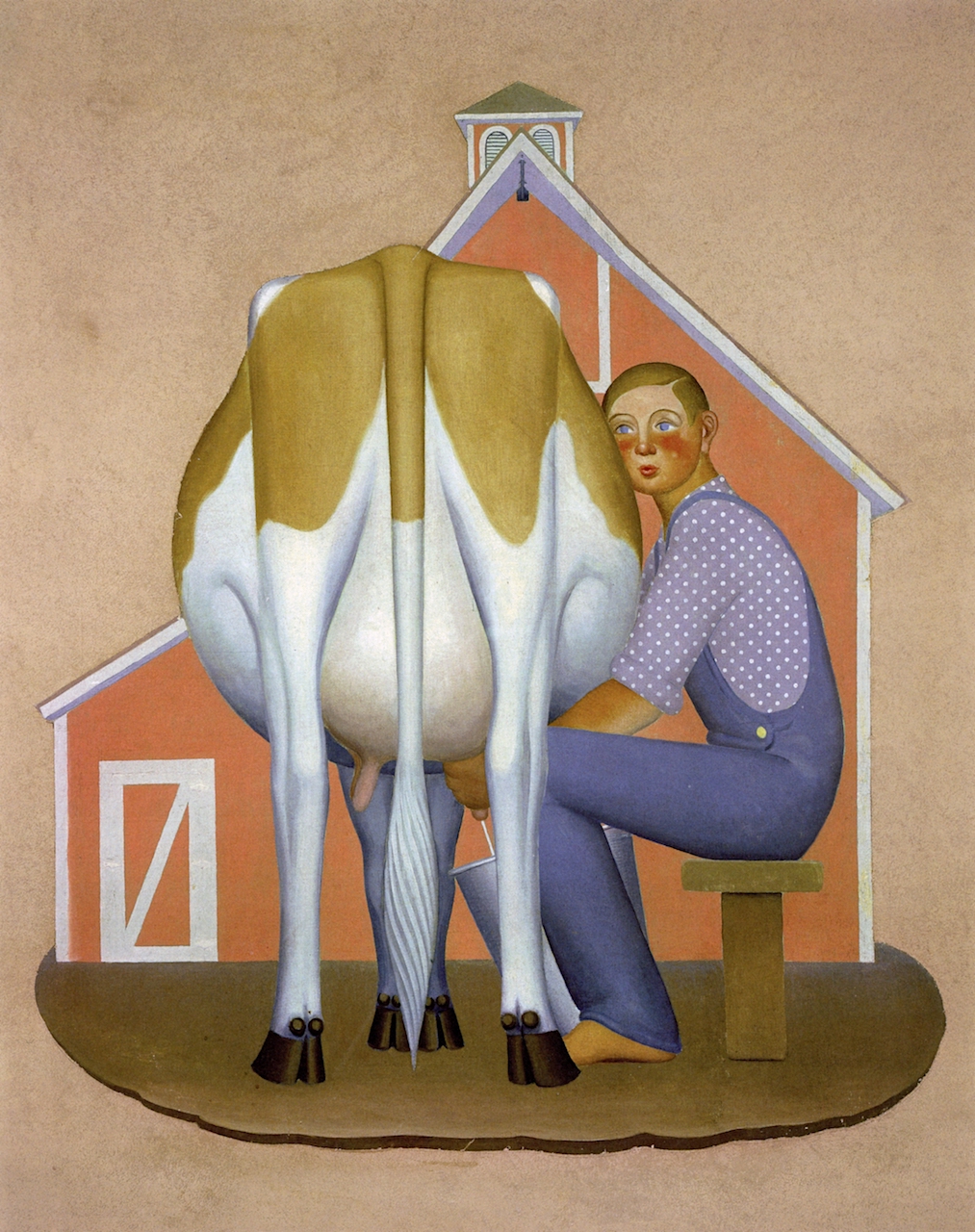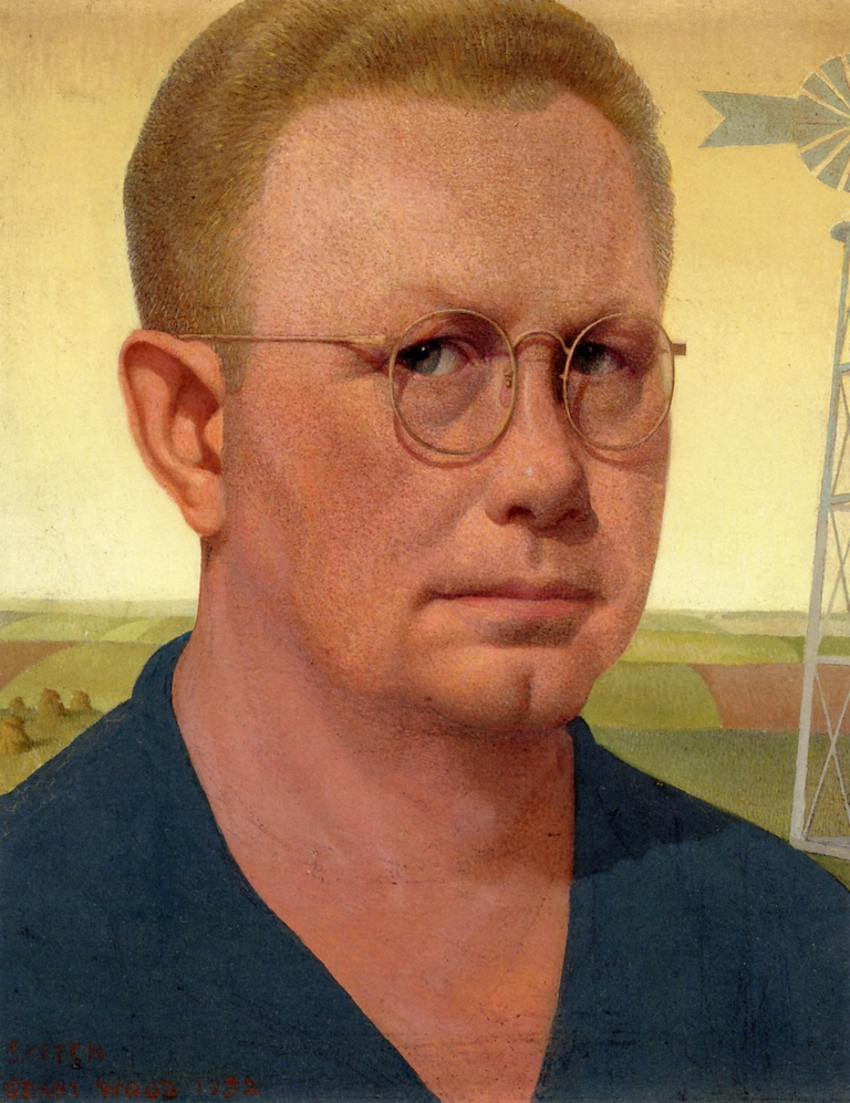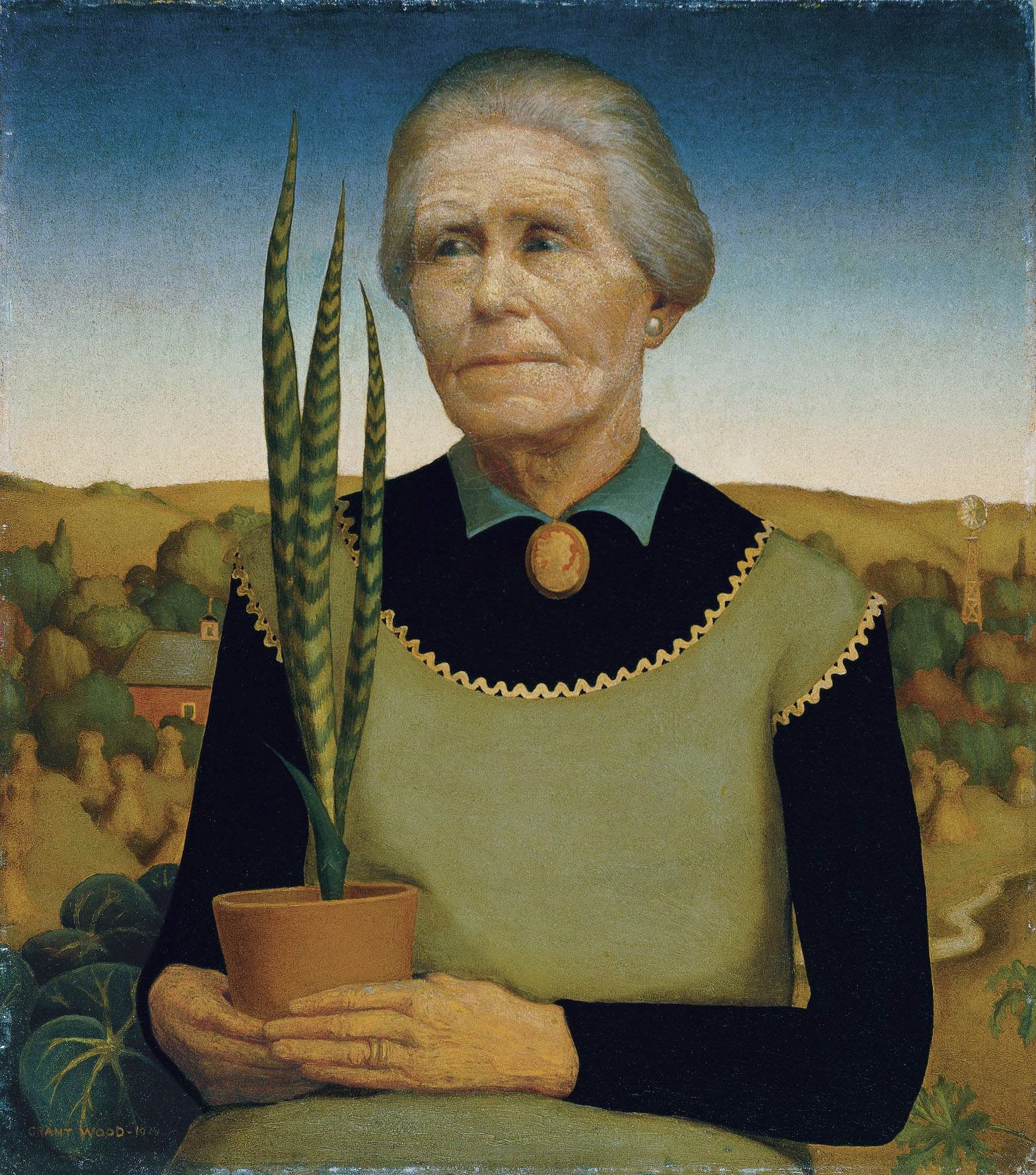 Auf jede Fall ist Grant Wood auch als Porträtist eine Erfahrung wert, denn er nimmt dem Abgebildeten jede Strenge, indem er seiner Schwester als Attribute ein Küken und eine Pflaume in die Hand legt, oder der größte Teil des Bildes „melkender Junge“ das Hinterteil der Kuh zeigt.