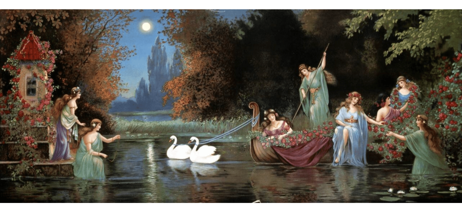 „Kahnbilder“, mit Nixen und Elfen bevölkert, und in allen möglichen Variationen aus stillen Gewässern und romantischen Kulissen kombiniert.