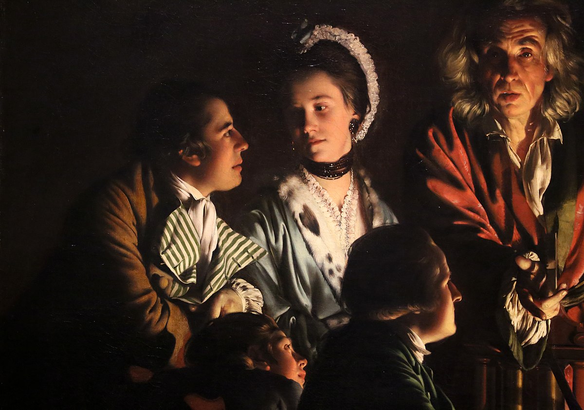 Für sein Bild „Das Experiment mit einem Vogel in der Luftpumpe“ studierte er exakt die Auswirkung der künstlichen Lichtquelle, in der Mitte des Gemäldes, auf die einzelnen Figuren.