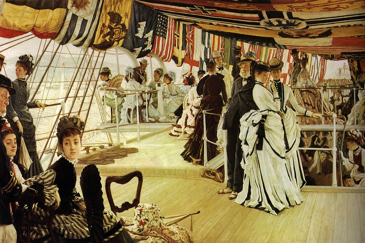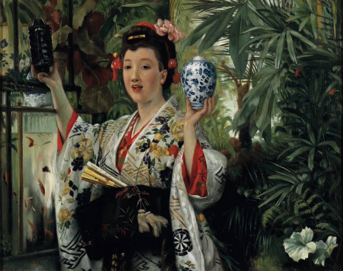 Bereits 1859 stellte Tissot fünf Gemälde mit mittelalterlichem Inhalt im Pariser Salon aus, und das „Treffen von Dr. Faust mit Margeruite“ wurde vom französischen Staat angekauft. Seine steile Karriere begann, als er 1863 die bisherigen Themen hinter sich ließ und die Pariser Society mitsamt deren Lebensstil sein Interesse fand. Das portraitieren der mondänen Gesellschaft in ihrer Umgebung machte ihn schlagartig berühmt und so begehrt, dass er sich bereits ein Jahr später ein Haus in der Hauptstadt bauen ließ. Auf Grund seines Faibles für Textilien ist es wenig verwunderlich, dass James sich auch dem Japonismus zuwendete.