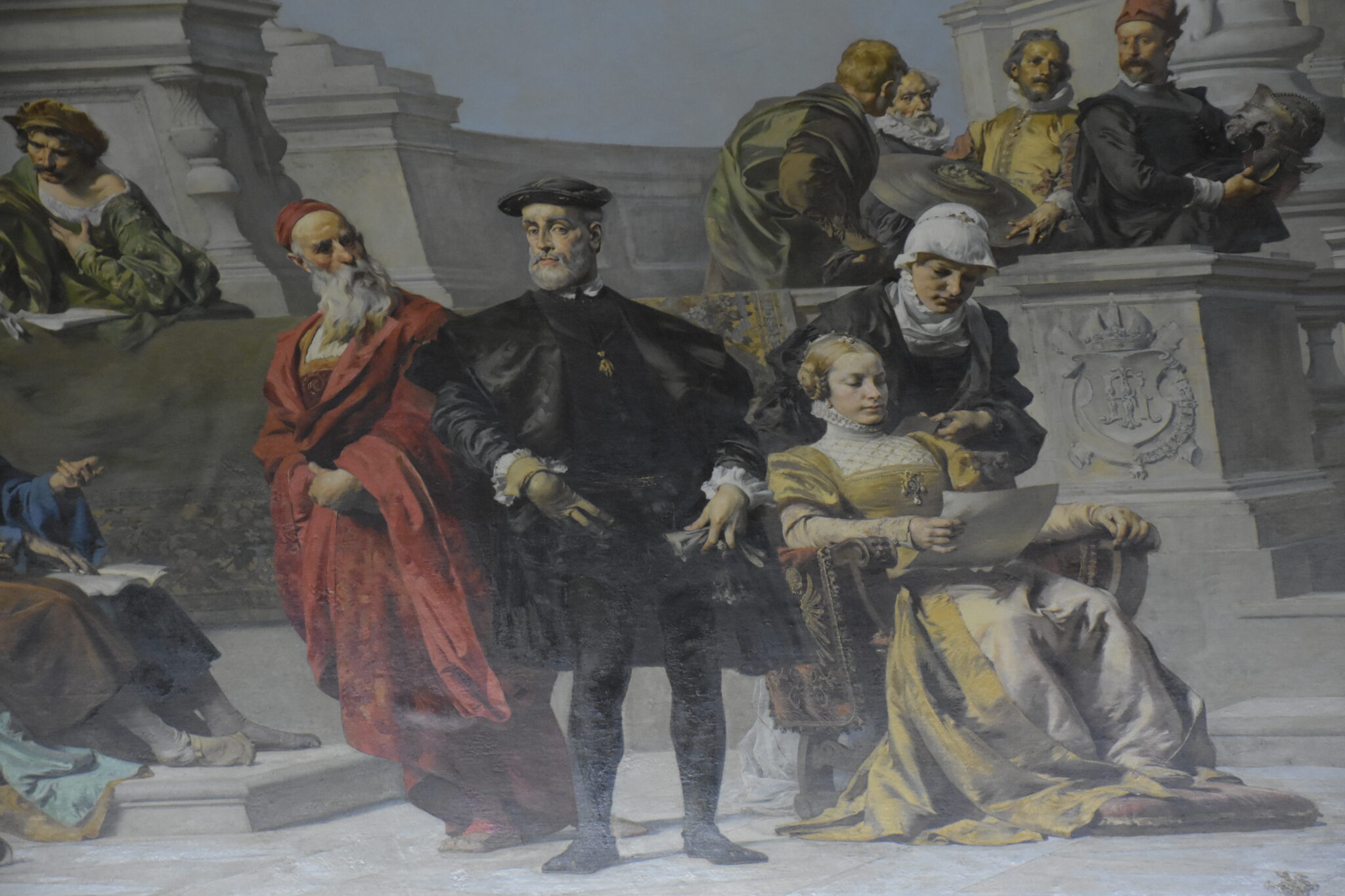 Karl V. (14) bildet das Zentrum um den Bildhauer Leone Leoni (6), den Goldschmied Valerio Belli (7). Benvenuto Cellini (8), mit seiner „Saliera“ (9) auf dem Schoß, befindet sich im Gespräch mit dem Uhrmacher Juanello Torriani (10). Der Bildhauer Giambologna (11) kommuniziert dahinter mit einer Person (12), deren Identität ungeklärt ist. Tizian (13) steht in roter Robe hinter dem Kaiser und rechts von diesem, lesen seine Ehefrau Isabella von Portugal (15) und seine Schwester Maria von Ungarn (16) in einem Brief.