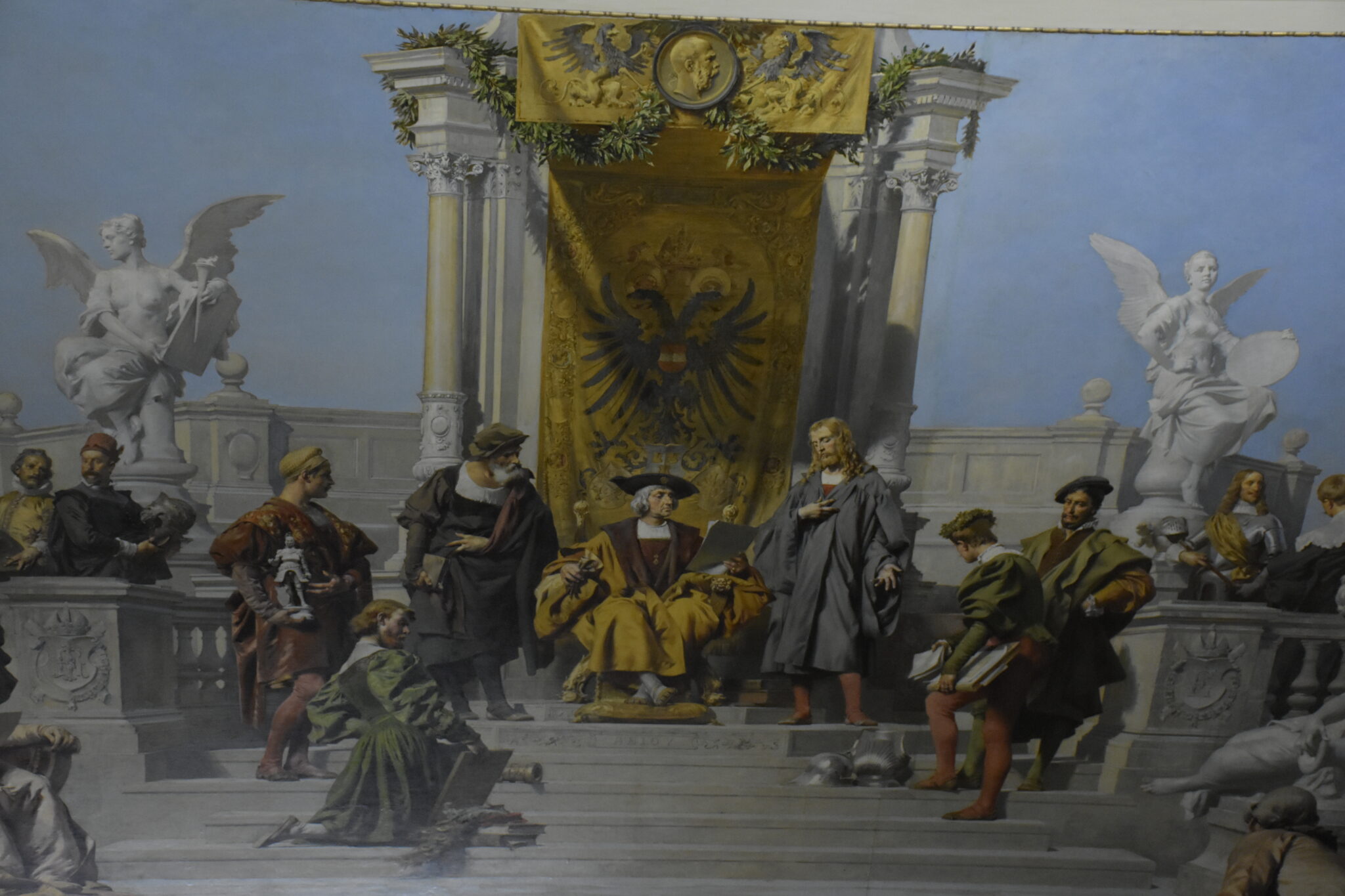 Oft kann es bei einem Museumsbesuch geschehen, dass man ein Kunstwerk erster Klasse übersieht: Die Architektur und Ausstattung eines Raumes des Museums. Sehr leicht passiert das, wenn man die Säle der Kunstkammer des Kunsthistorischen Museums betritt. Es herrscht ein derart reiches Angebot an Kleinoden und Meisterwerken, dass man schon damit ausreichend gefordert wird. Jedoch im Goldsaal dieses Museums, sollte man auf jeden Fall die Augen zur Decke des Raumes richten, denn das dort befindliche Fresko wird dem Kunstinteressierten historische Begegnungen visualisieren.
