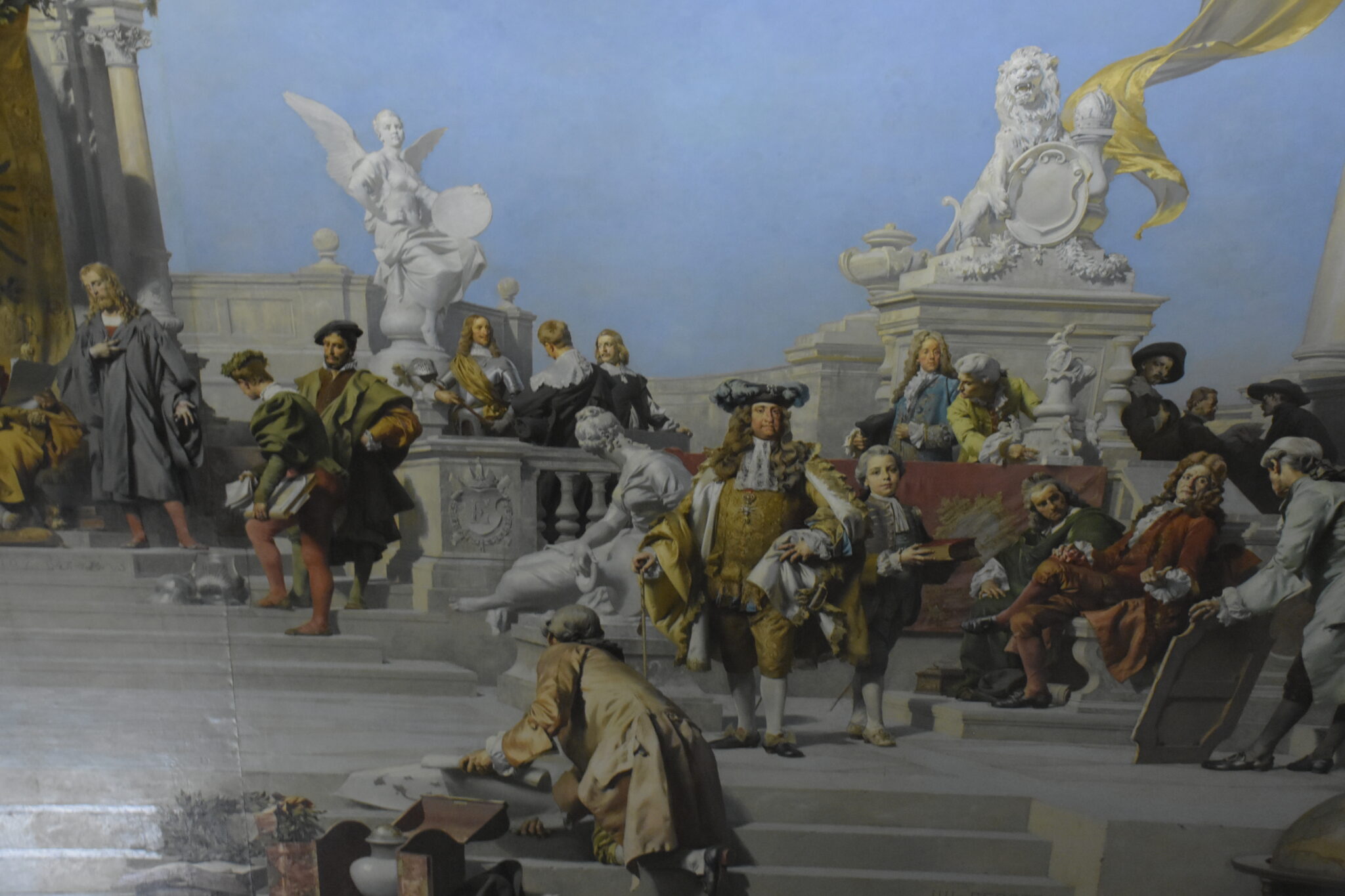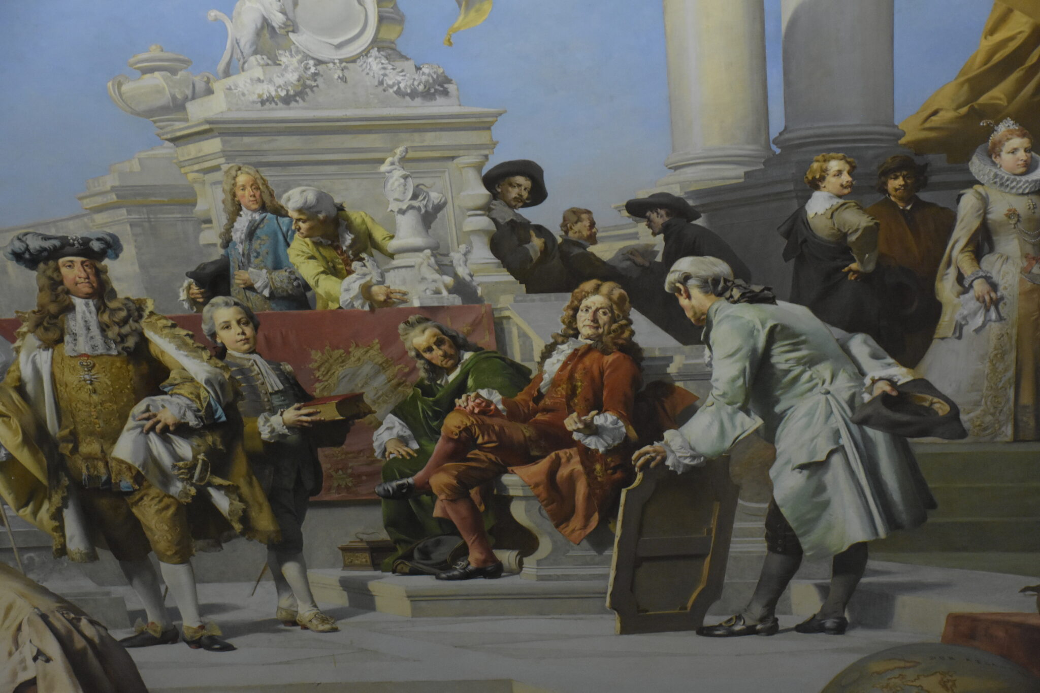 Selbstbewusst tritt uns Karl VI. (34) entgegen, zu dessen Füßen der Erbauer des Stifts Melk, Jakob Prandauer (32) eine Schriftrolle öffnet. Prinz Eugen von Savoyen (35) bewundert das Modell in den Händen Georg Raffael Donners (36). Der Hofantiquar Carl Gustav Heraeus (37) und Johann Bernhard Fischer von Erlach (38), der Architekt der Karlskirche, lassen sich vom Barockmaler Daniel Gran (42) dessen neuestes Werk präsentieren.