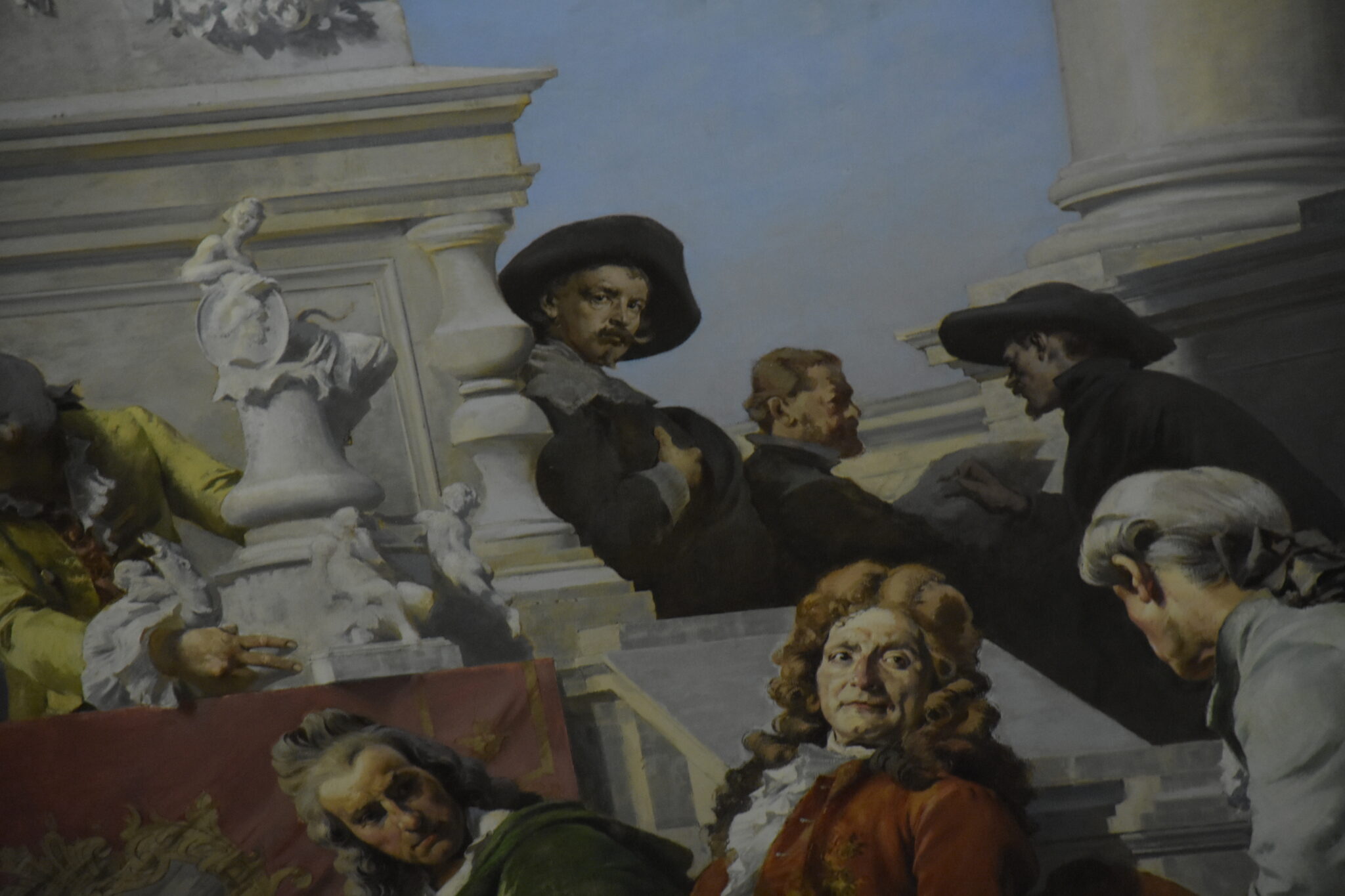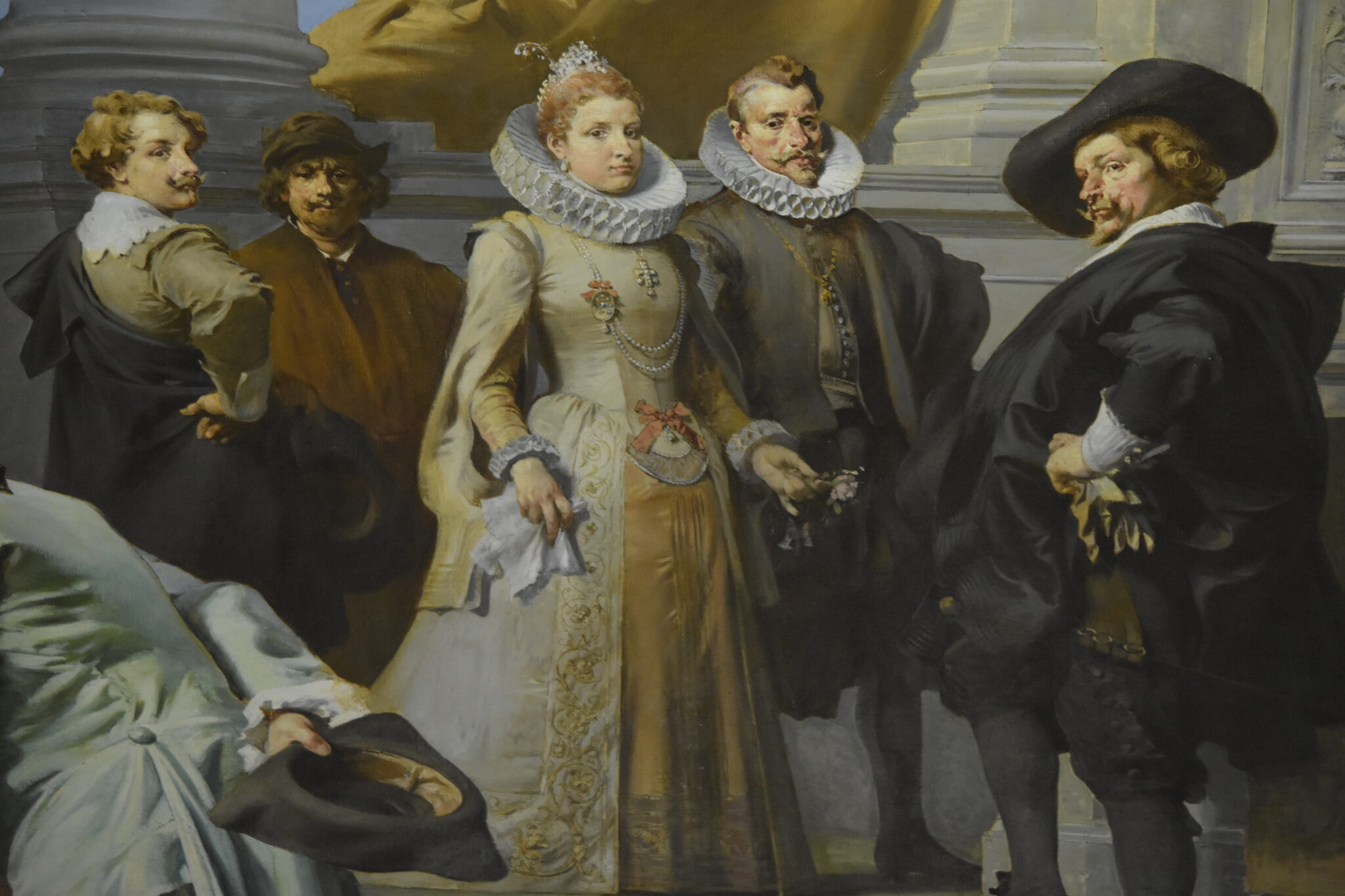 Den Abschluss des Deckengemäldes bieten Isabella Clara Eugenia (45) und Erzherzog Albrecht VII. (46) in einem erlauchten Kreis von Malern – Sir Anthonis van Dyke (43), Rembrandt Haaremszoon van Riyn (44) und Peter Paul Rubens (45).