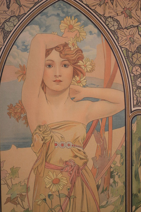 Alphonse hatte seinen Stil gefunden: betörend schöne, langhaarige Frauen, erlesen gekleidet, und pastellfarbene Palette umrahmt von floralen und dekorativen Elementen des Jugendstils und Altertums.