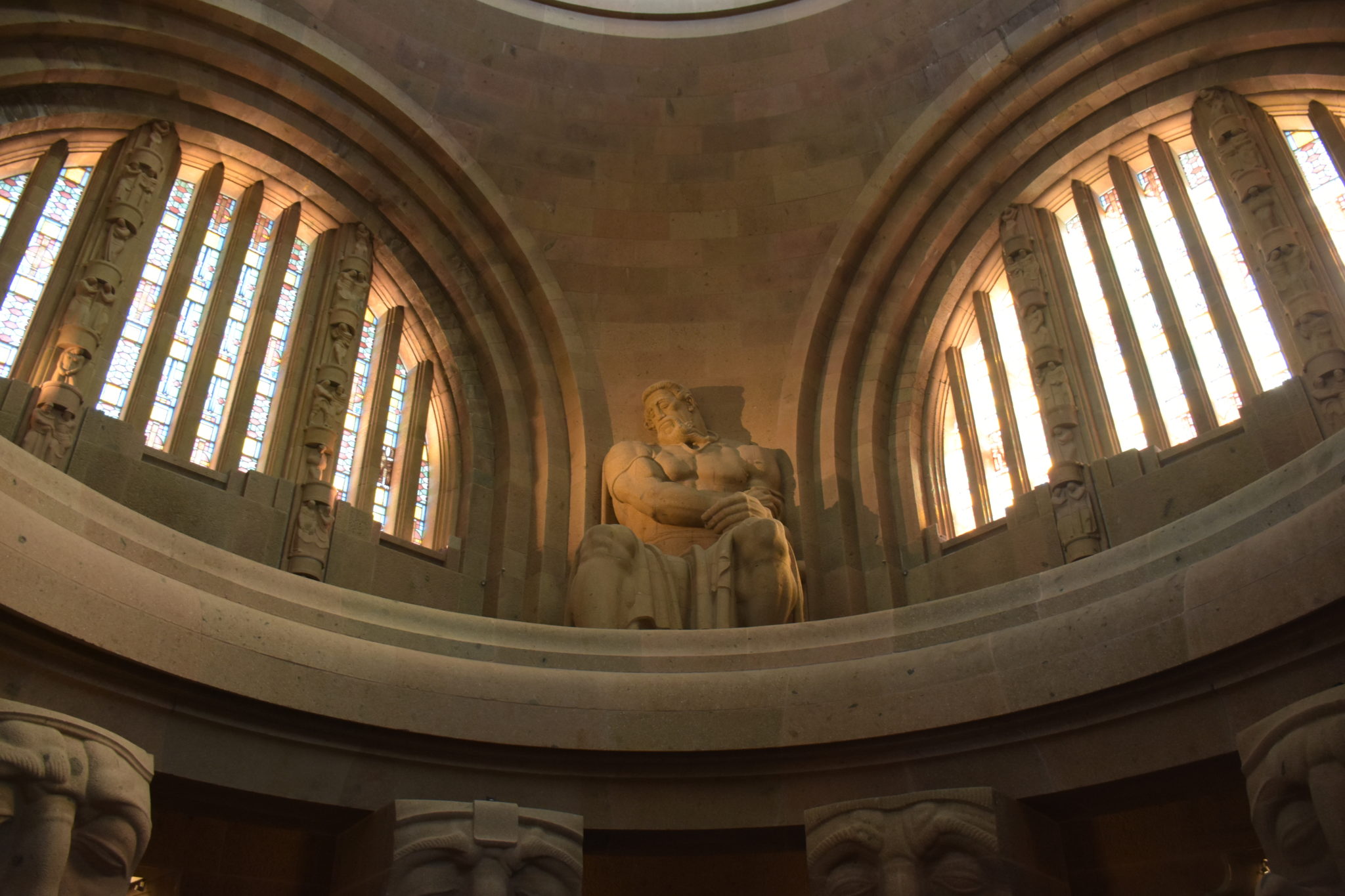 Oberhalb der, nach oben offenen, Krypta erhebt sich die 60 Meter hohe Ruhmeshalle, deren Seitenwände mit 4 kolossalen Darstellungen der Tugenden des deutschen Volkes besetzt sind. Diese fast 10 Meter hohen Statuen symbolisieren: Opferbereitschaft, Volkskraft, Tapferkeit und Glaubensstärke.