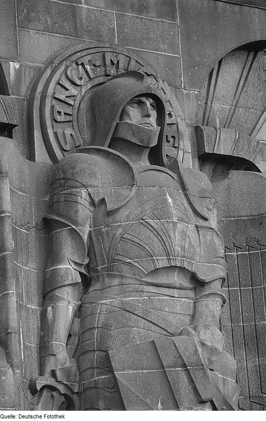 Auf dem 42.500 m² großen, von der Stadt Leipzig zur Verfügung gestellten, Grund setzten sie ein wuchtiges Monument in die Realität um. Über dem Eingang des 91 Meter hohen Mahnmals, steht aufrecht mit Feuerschwert und Kreuzritter-Schild der fast 20 Meter hohe Erzengel Michael.