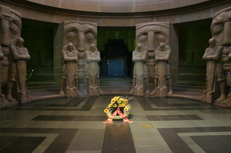 Durch das Betreten des Bauwerks gelangt man, nach 136 Stufen, in die Krypta, welche die letzte Ruhestätte der 120.000 Gefallenen symbolisieren soll. Umgeben wird die Krypta von 8 Zweier-Gruppen steinerner Ritter mit gesenkten Köpfen, welche vor den Masken sterbender Krieger ebenfalls Totenwache halten.