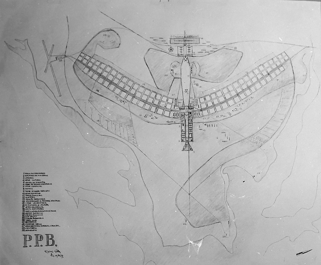 Costa war ein Bewunderer des Architekten Le Corbusier und ein Verfechter von Funktionalität und Rationalität. Aus diesen Gründen teilte er die Stadt in vier Bereiche auf: Arbeiten, Wohnen, Kultur und Sport, und als Grundriss ließ er zwei Achsen im rechten Winkel aufeinandertreffen. Durch geologische Gegebenheiten wurde die Querachse etwas gebogen, wodurch sich aus der Vogelschau die Form eines Flugzeuges ergab. Die Unterlagen für den Wettbewerb trugen den Namen „Plano Piloto“, deshalb wird bis heute von vielen angenommen, dass die Flugzeugform beabsichtigt war.