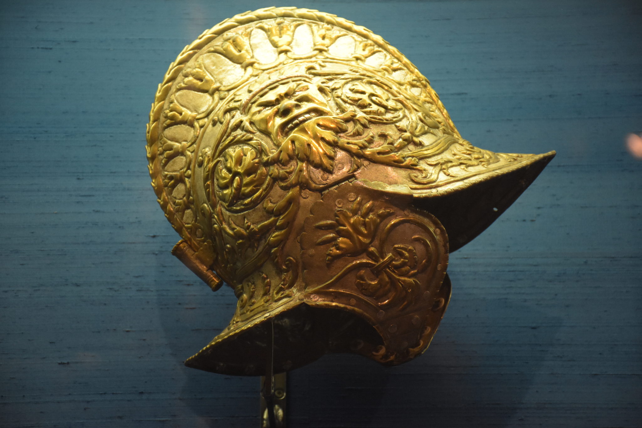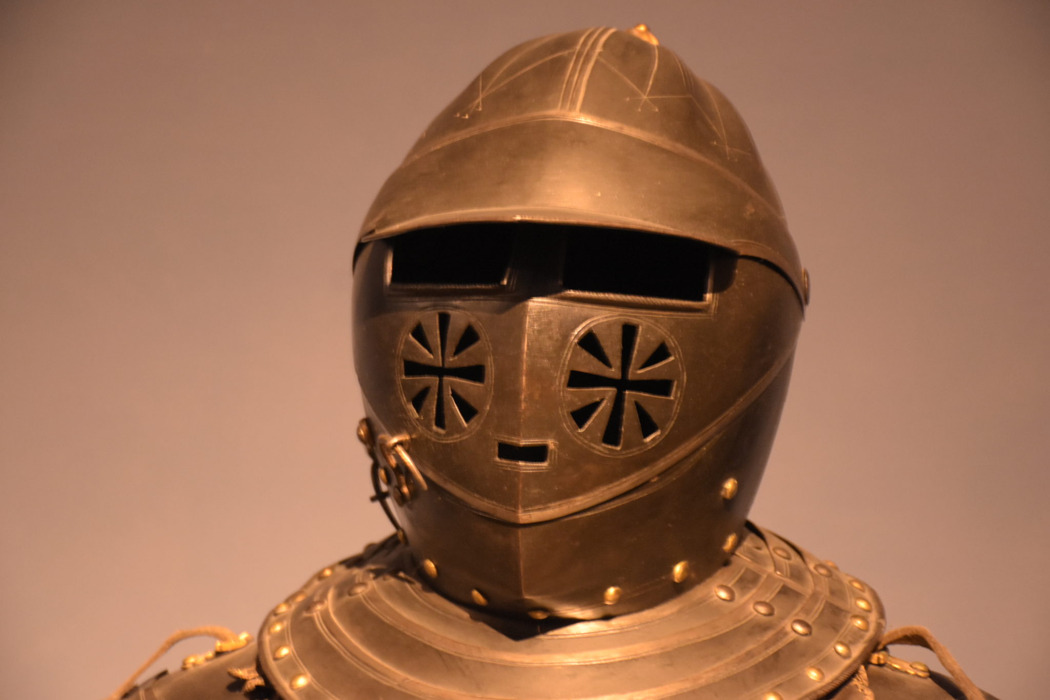 Aber auch der Kostspieligkeit waren keine Grenze gesetzt, wie man an dieser Sturmhaube mit dazu passendem Rundschild ersehen kann.