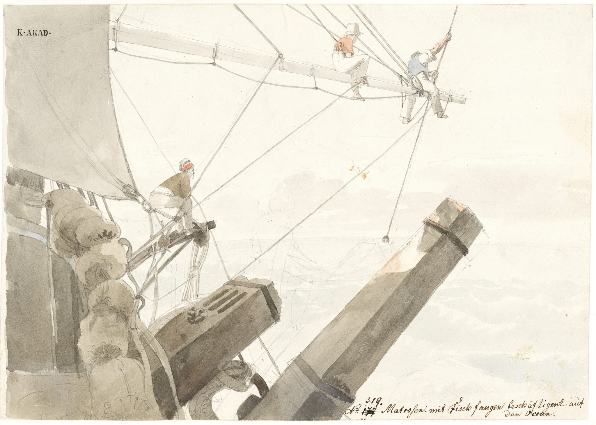 - Matrosen mit Fisch fangen beschäftigt auf dem Ozean, Foto: © Kupferstichkabinett der Akademie der bildenden Künste, Wien