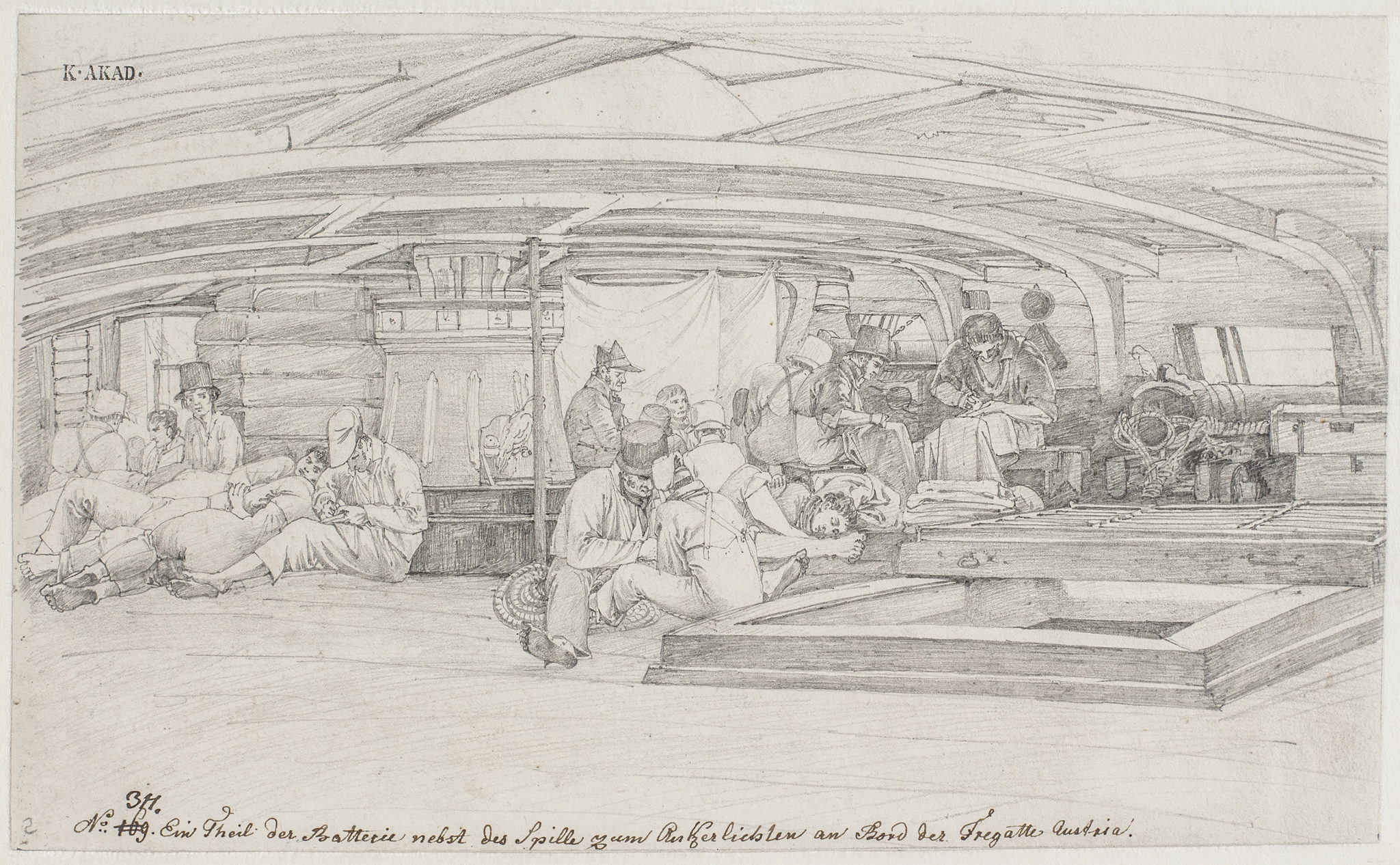 - Ein Theil der Batterie nebst des Spille zum Ankerlichten an Bord der Fregatte Austria, Foto: © Kupferstichkabinett der Akademie der bildenden Künste, Wien